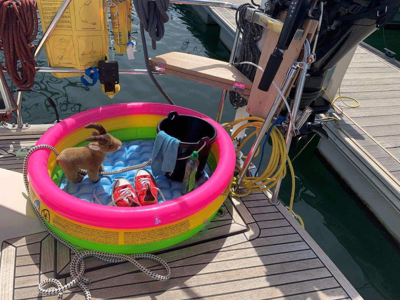 The crossing from Gibraltar to Las Palmas was good fun. But the flag is a little bit worn. Maybe it was more wind than expected. It would now be best to relax in the pool. But while in the marina of Las Palmas, little ibex’ pool is used as cockroach prevention center (shoe cleaning) to avoid bringing eggs or critters onto the bot when coming back from one of the trips to land.