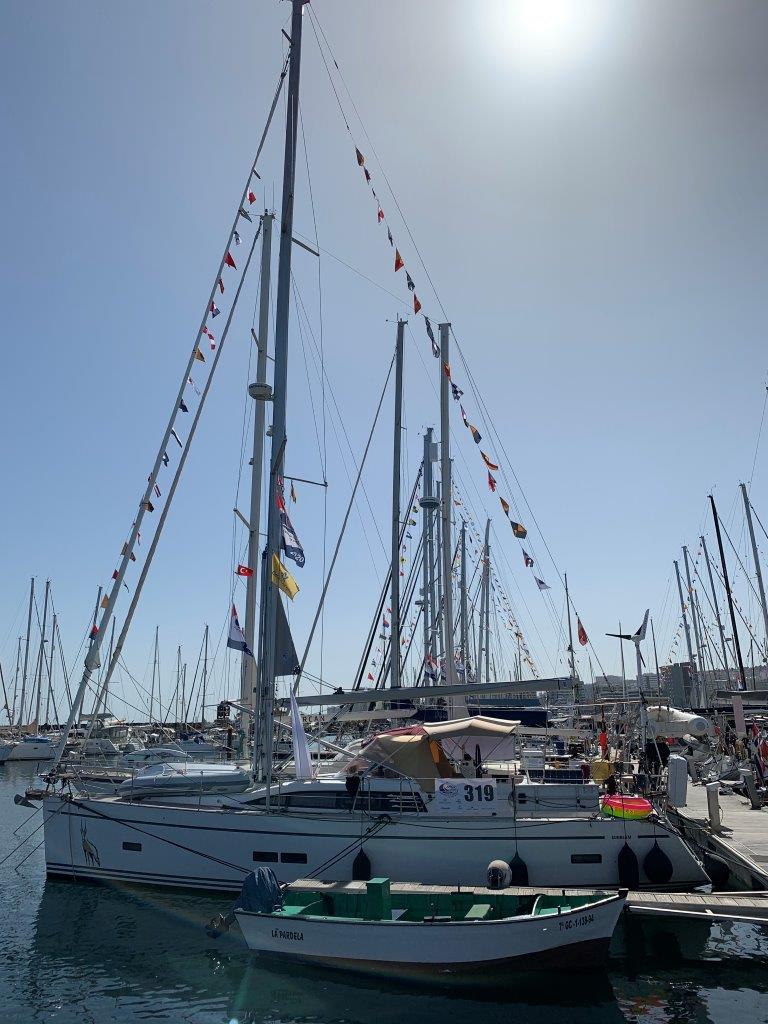 The ARC+ fleet is gathering in Las Palmas. Together with 25 other boats little ibex will go across the Atlantic Ocean. She decorates the boat with flags. It is quite some work to knot them all together, but it sure looks pretty.