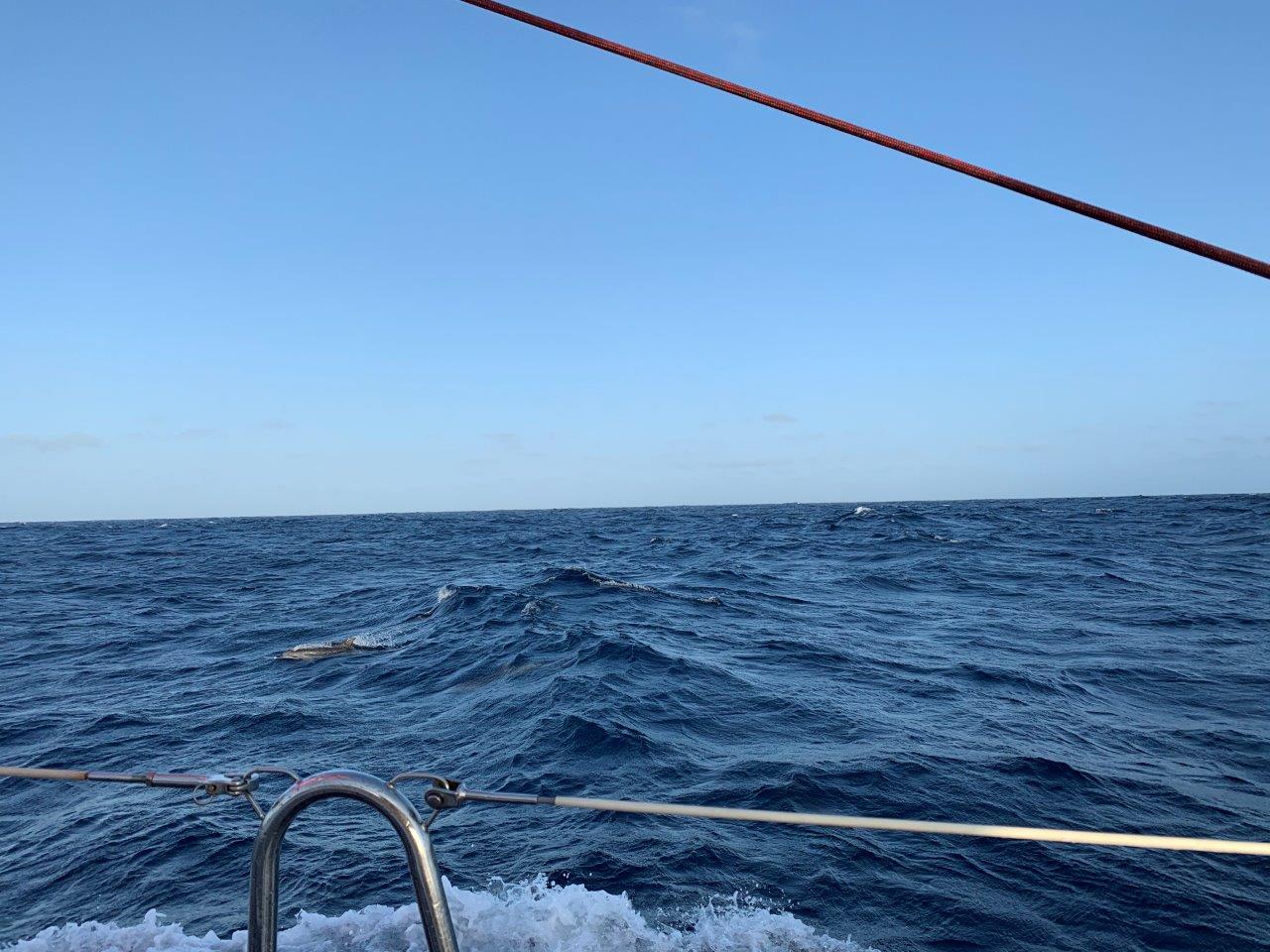 Daily routines on board included weather routing and checking the moving boat parts for wear. Especially lines can be very prone to constant chafing. Then there were some dolphins. Can you find them in the picture below?
