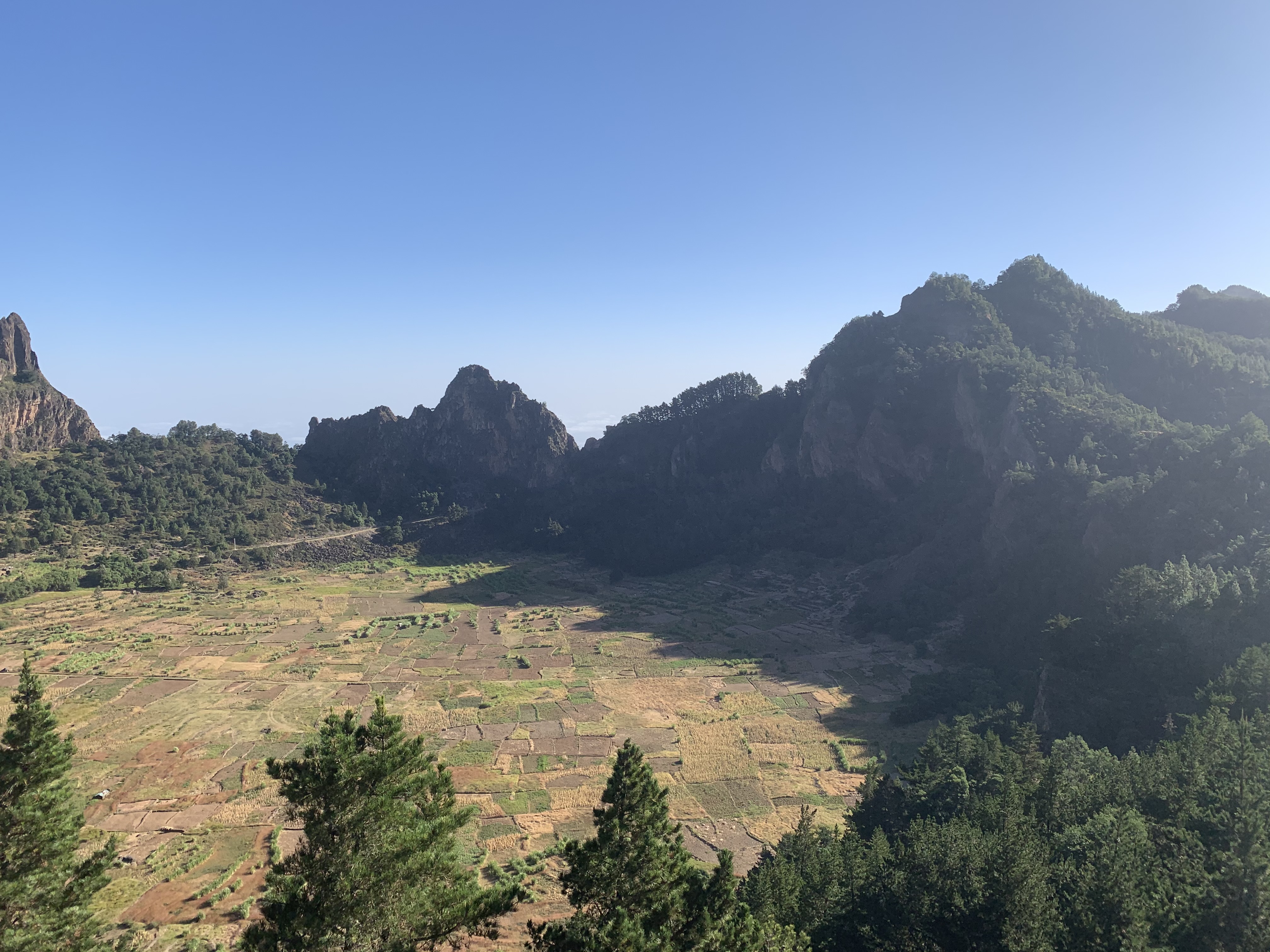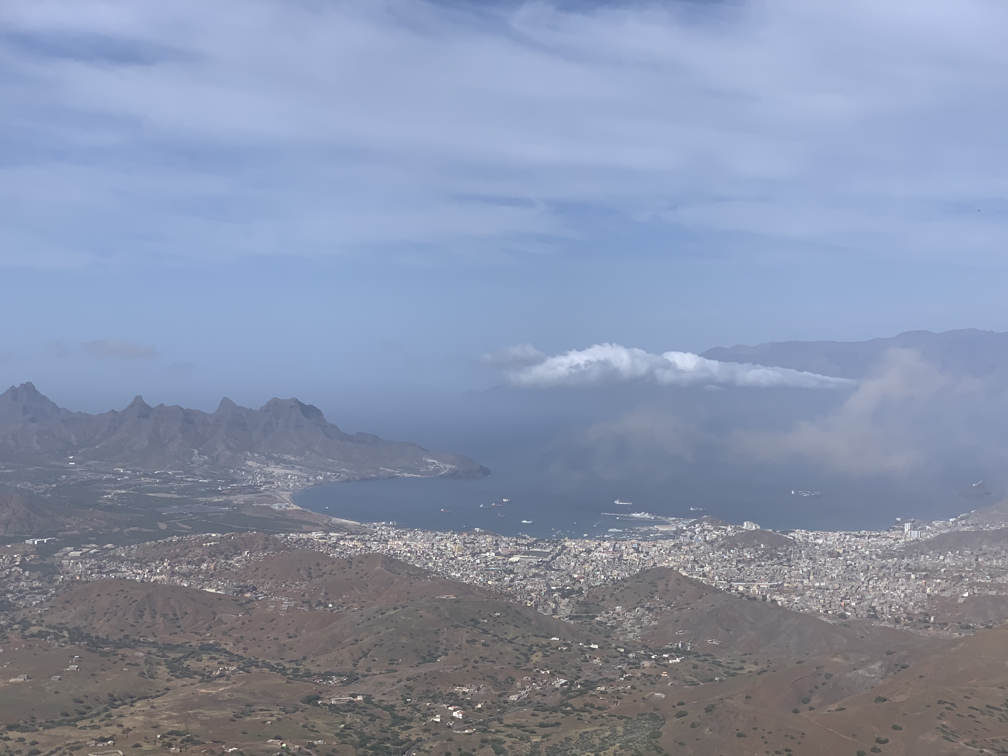 Nichtsdestotrotz haben wir die Zeit genutzt. Gleich am Tag nach unserer Ankunft ging es mit Minibus auf eine Tour über die Insel Sao Vicente. Gleich mal auf den höchsten Berg, in diesem Fall bis zum Gipfel mit dem Auto befahrbar. Die „Maisfelder“ entlang der Straße werden von „Flüchtlingen“ anderer Inseln „bestellt“. Es handelt sich nicht um normalen Ackerbau, sondern eine Überlebenstrategie dieser Flüchtlinge, die gegen Abgabe von 60% der Ernte auf diesen „Gstettn“ zwischen Steinen Maispflanzen hochziehen, und mitten drin in Unterständen hausen. Eine Situation, die sich durch Corona verschlimmert hat, weil es mehr von diesen Flüchtlingen gibt.
