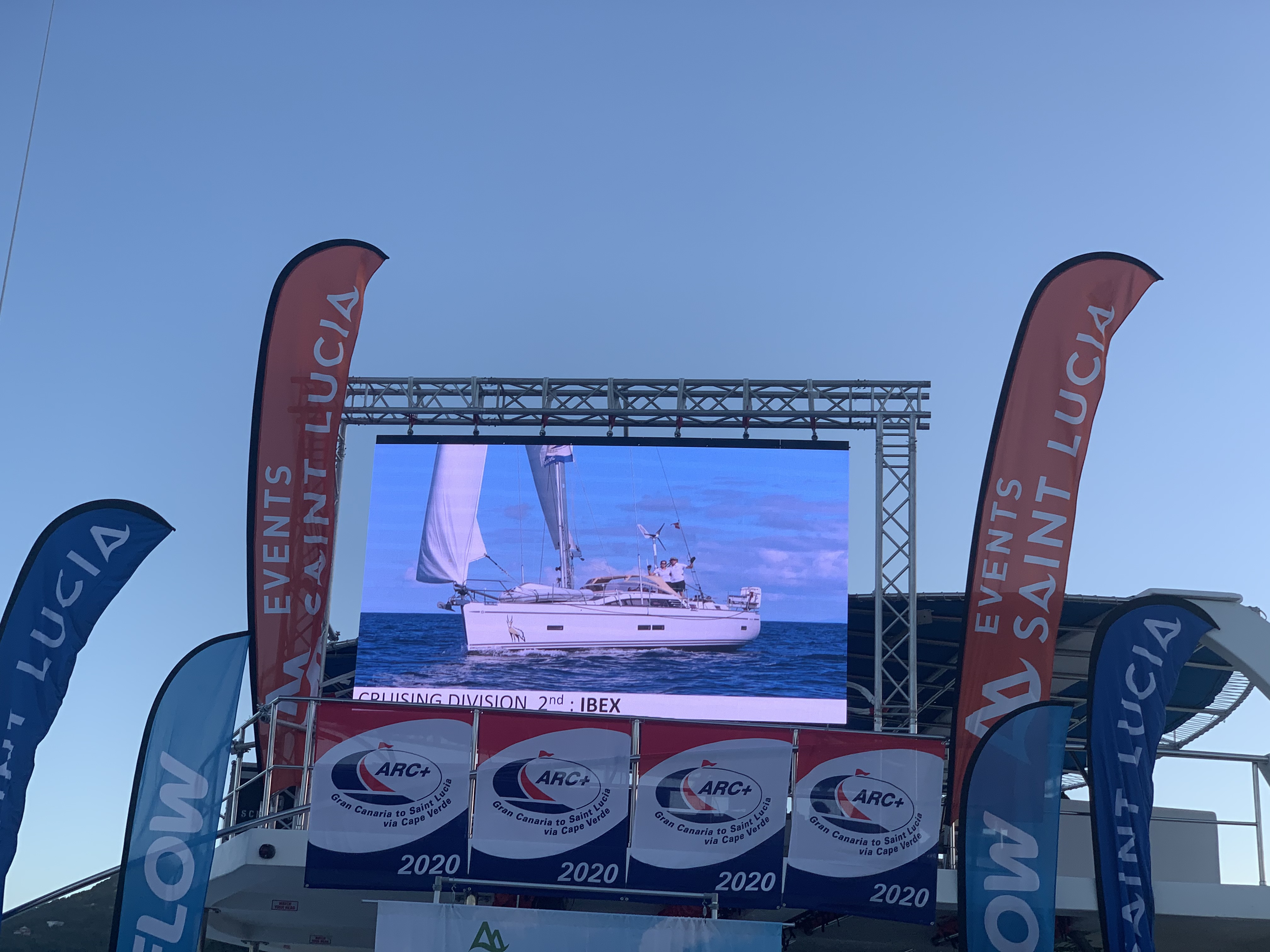 Die ersten Tage waren natürlich noch dem Schiff gewidmet, putzen, reparieren, warten, aber alles keine großen Sachen. Parallel bereiteten wir auch noch anderen Crews einen ähnlichen Empfang, wie wir ihn erleben durften. Es dauert ja ein paar Tage, bis die gesamte Flotte angekommen ist. Die Preisverleihung bildete dann den Abschluss der ARC+ Veranstaltung. Obwohl größere Versammlungen Corona-bedingt auch in St Lucia nicht erlaubt waren, war es ein sehr nettes Event. Schlauerweise hat sich der Veranstalter dazu entschlossen das Ding direkt auf unserem Steg steigen zu lassen. Am Stegkopf legte ein riesen Katamaran mit Großleinwand an, ein Soundsystem wurde über den Steg verteilt aufgebaut. Die Livemusik wanderte über den Steg. Strenggenommen waren alle dazu angehalten auf ihren Booten zu bleiben. Naja, das hat nicht ganz so funktioniert, aber die Grüppchen am Steg hielten sich in Grenzen und so blieb es bei einer ganz gut Corona konform verteilten Party.