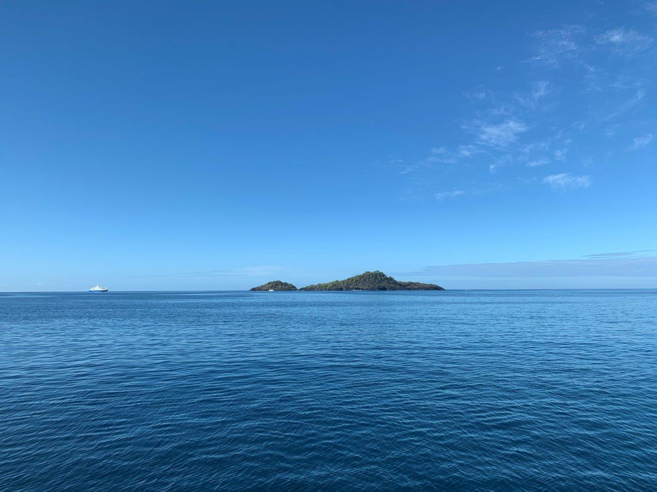 When anchoring in Malendure little ibex accesses the famous Jacques Cousteau Underwater Reserve. She watches others go diving (it is just not her thing). Below you can see how the dinghy is being tied up to a line between land and a buoy. Little ibex enjoys the view onto Pigeon Island.