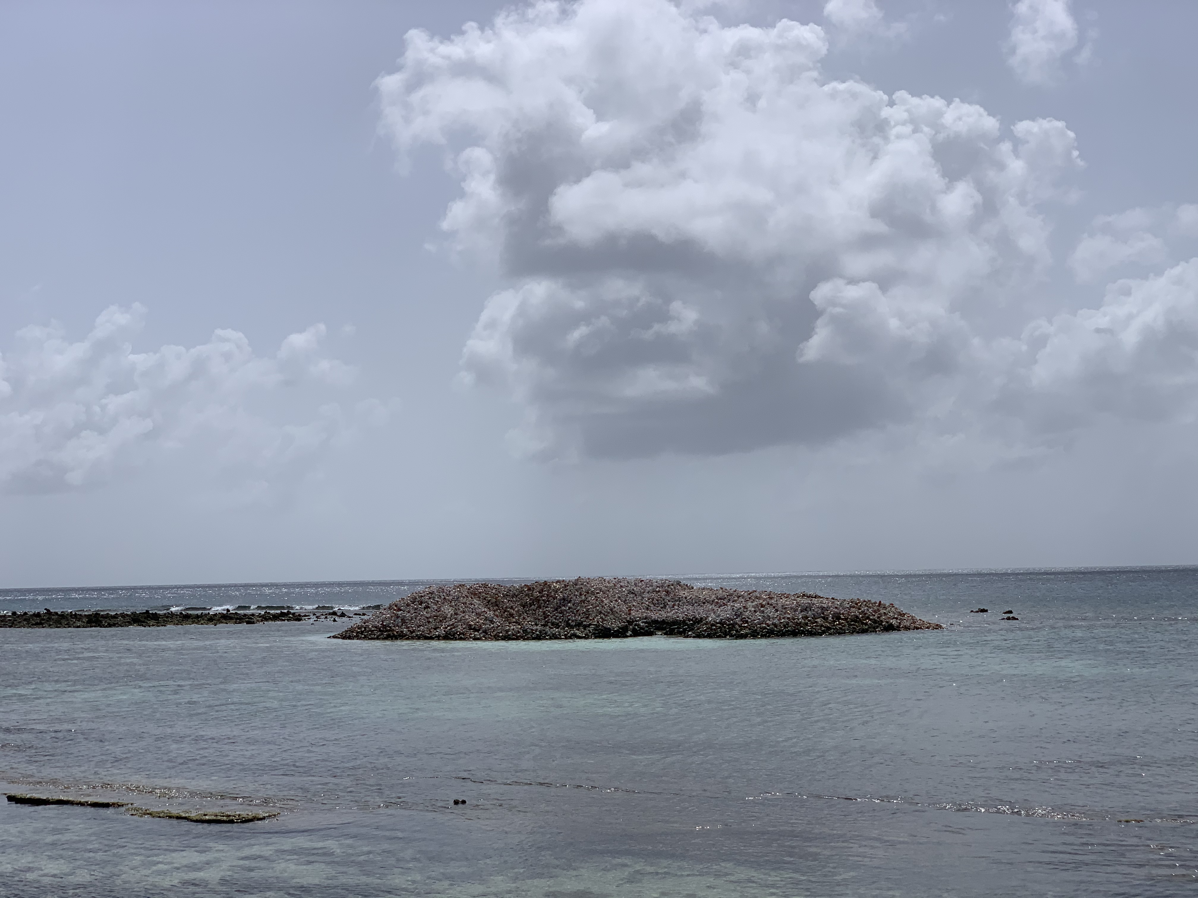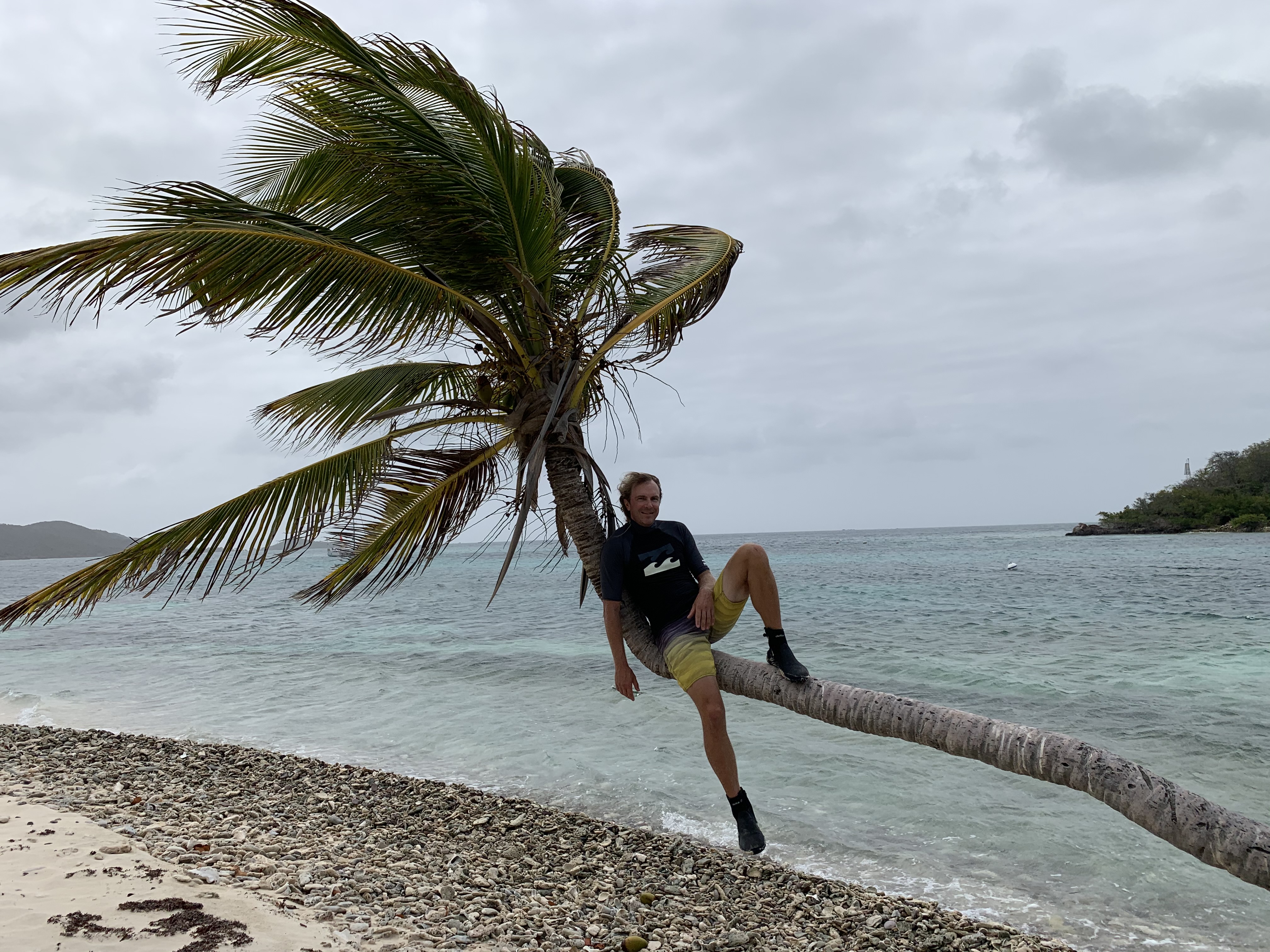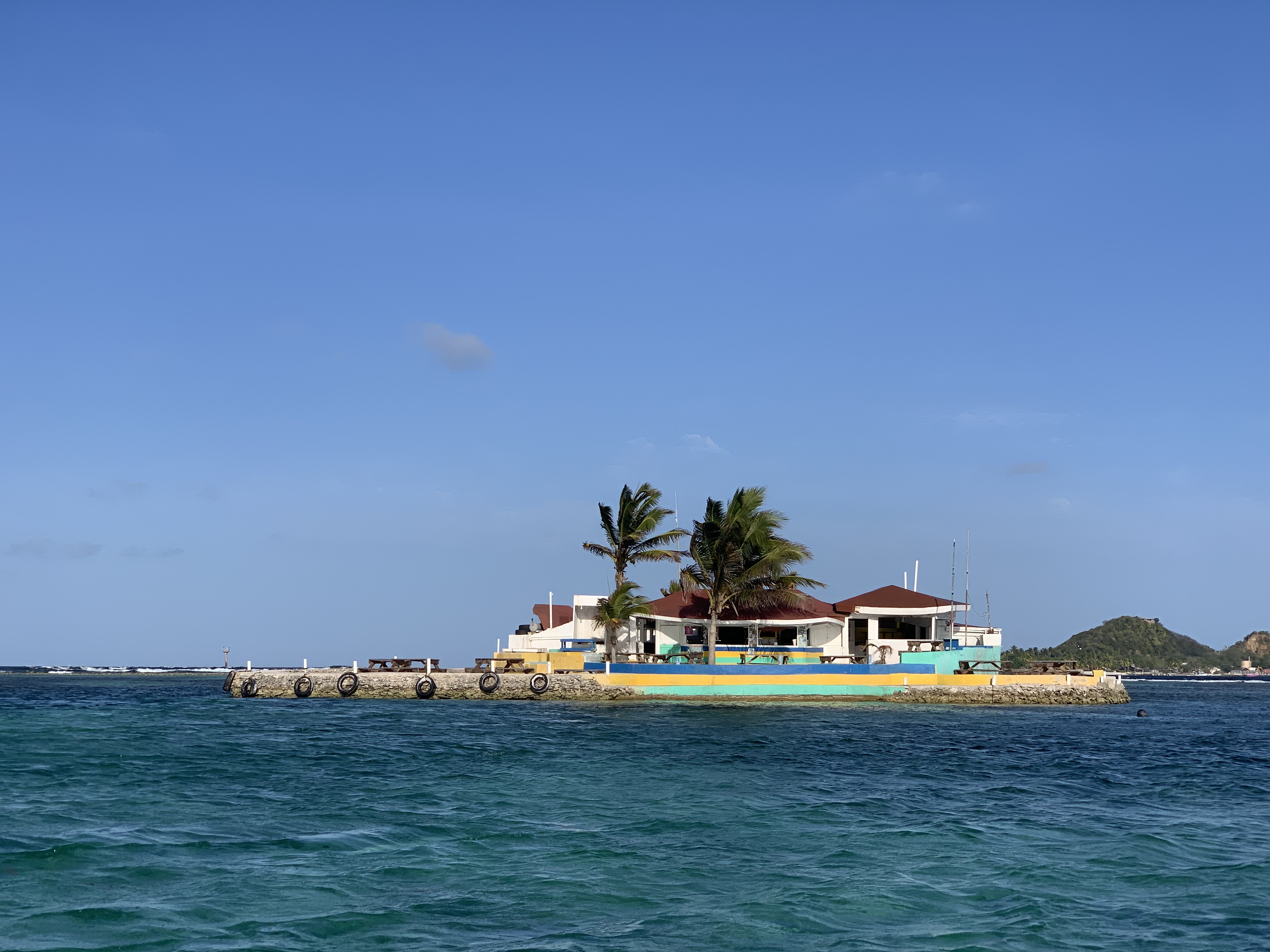 Berühmt hier ist Happy Island, eine auf Muscheln aufgebaute Mini-Insel mit genau einer Bar drauf. Der Besitzer ist aktuell im Krankenhaus, der Care-Taker Charly Brown arbeitet sonst als Musiker auf Kreuzfahrtschiffen. Jetzt passt er auf Happy Island auf und ist gleichzeitig Barkeeper, Koch, DJ, Reinigungskraft, etc. Problem ist nur: er arbeitet und lebt auf der Mini-Insel hat aber kein Dinghy um an Land zu kommen. So nehmen wir ihn auch ein paar Mal mit. So kann er auch einkaufen um dann für uns zu kochen.