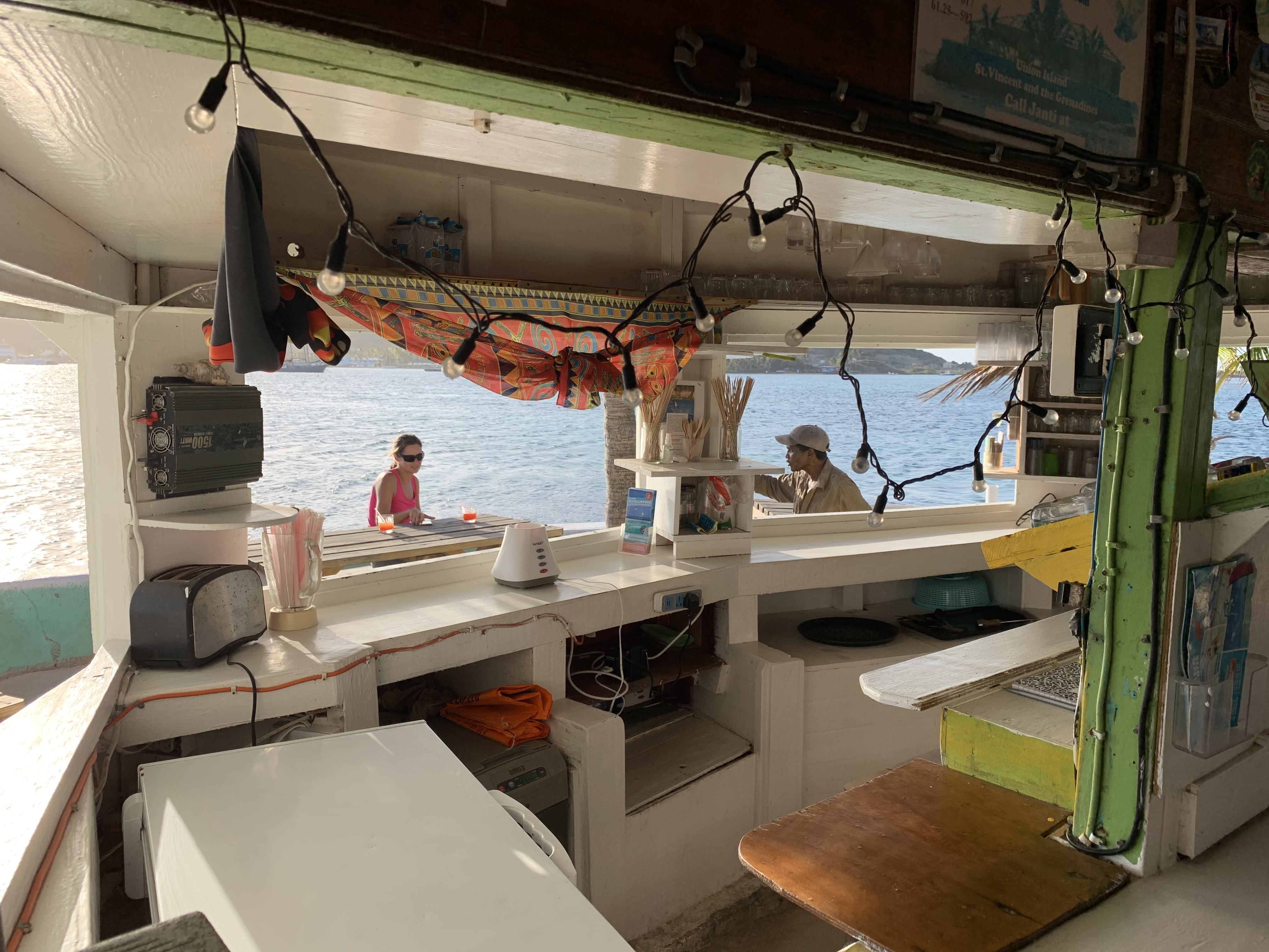 Als wir im einzigen Lokal der Locals einen Tisch für 2 reservieren, ahnen wir nicht, dass wir hier mit DEM Tisch am einzigen Balkon mit Aussicht auf die gesamte Bucht bekommen, weil es sonst keine Touristen-Gäste gibt. Die Locals benutzen das Lokal primär für Take-Away. Grundsätzlich beginnt mit Mustique für uns eine Zeit abseits aller Boote.