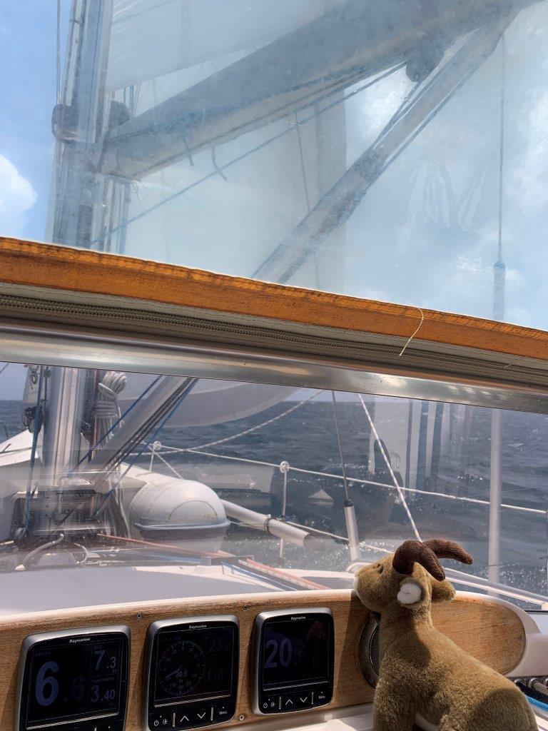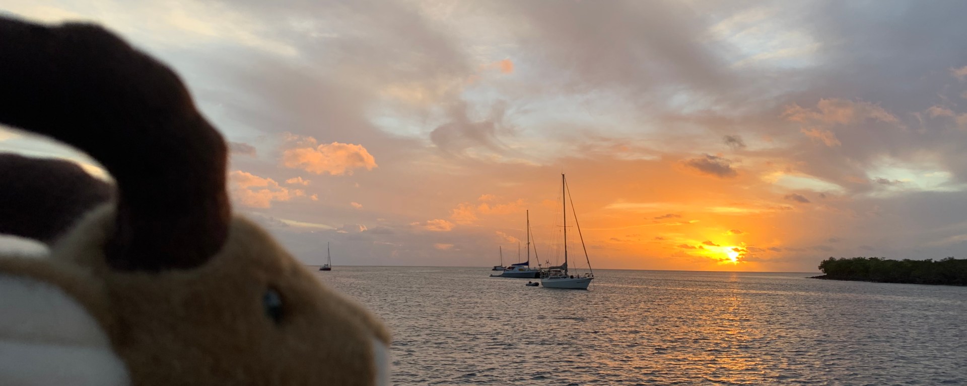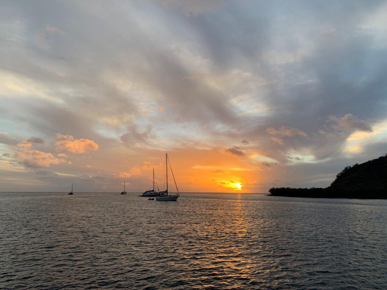 Little ibex is happily sailing in 25 kn of wind from St Vincent and the Grenadines to Carriacou, Grenada. She is in the 2nd reef in and still doing 7- 8 knots. Arriving in Tyrell Bay she needs to remain in quarantine until the entry PCR results are available. But colorful sunsets make the wait really easy.
