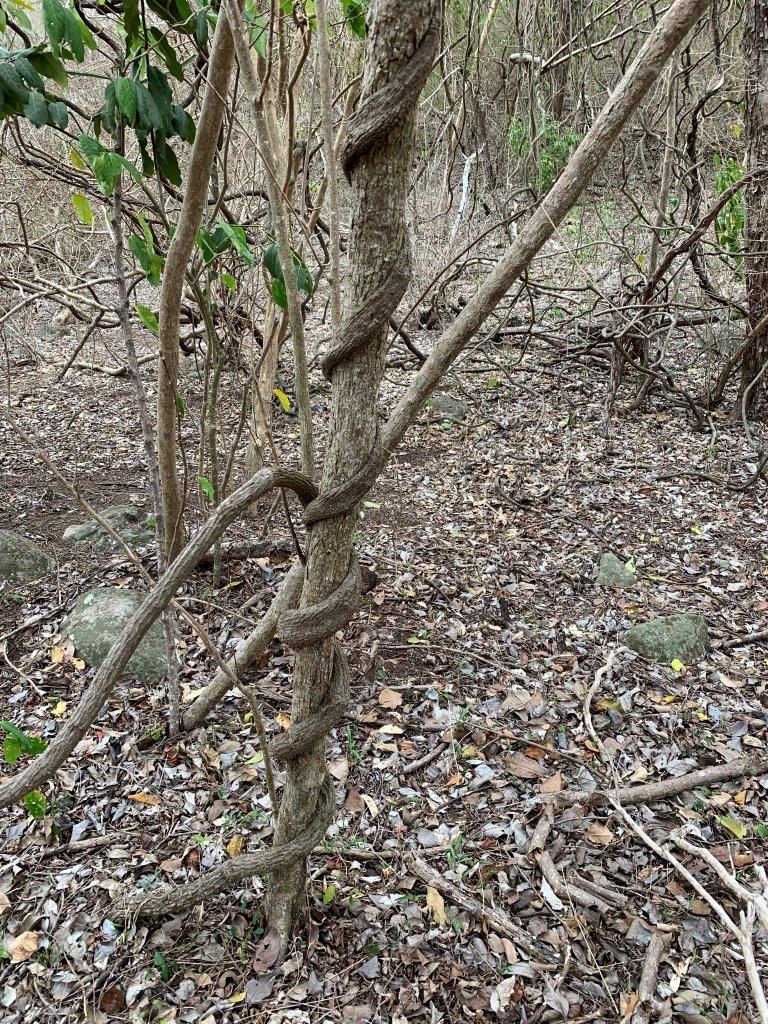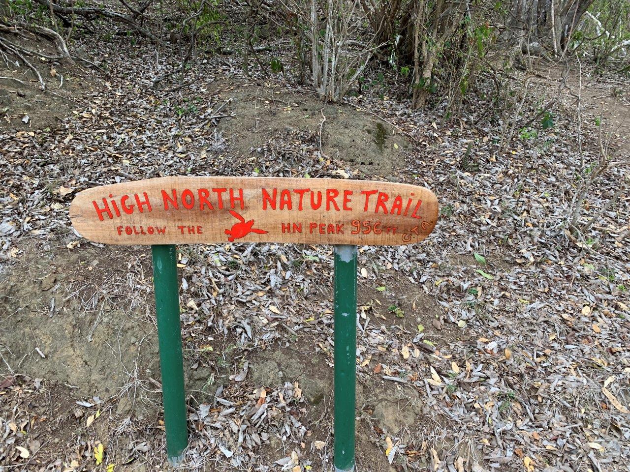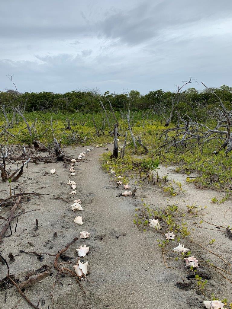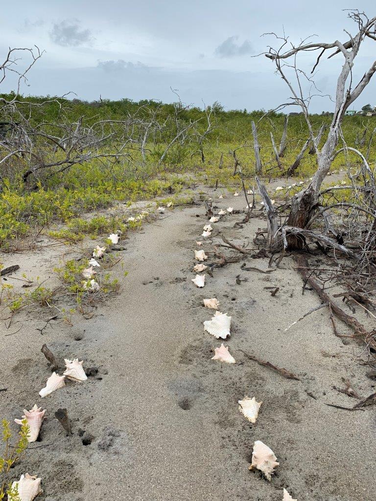 Exploring the island also means hiking up a hill and walking to the beach. This time she followed the turtle up the mountain and the conches to the sea. Interesting signposts.