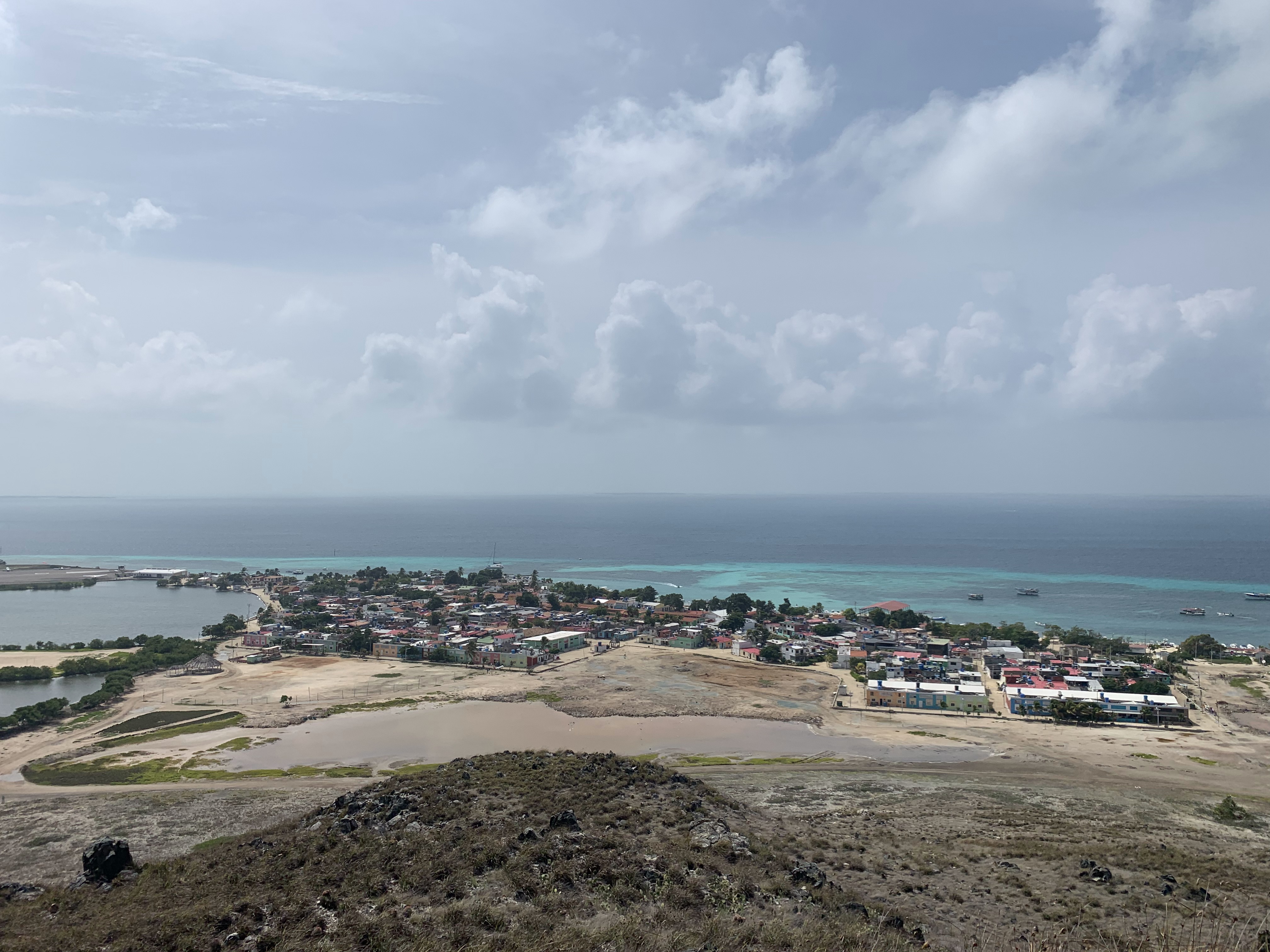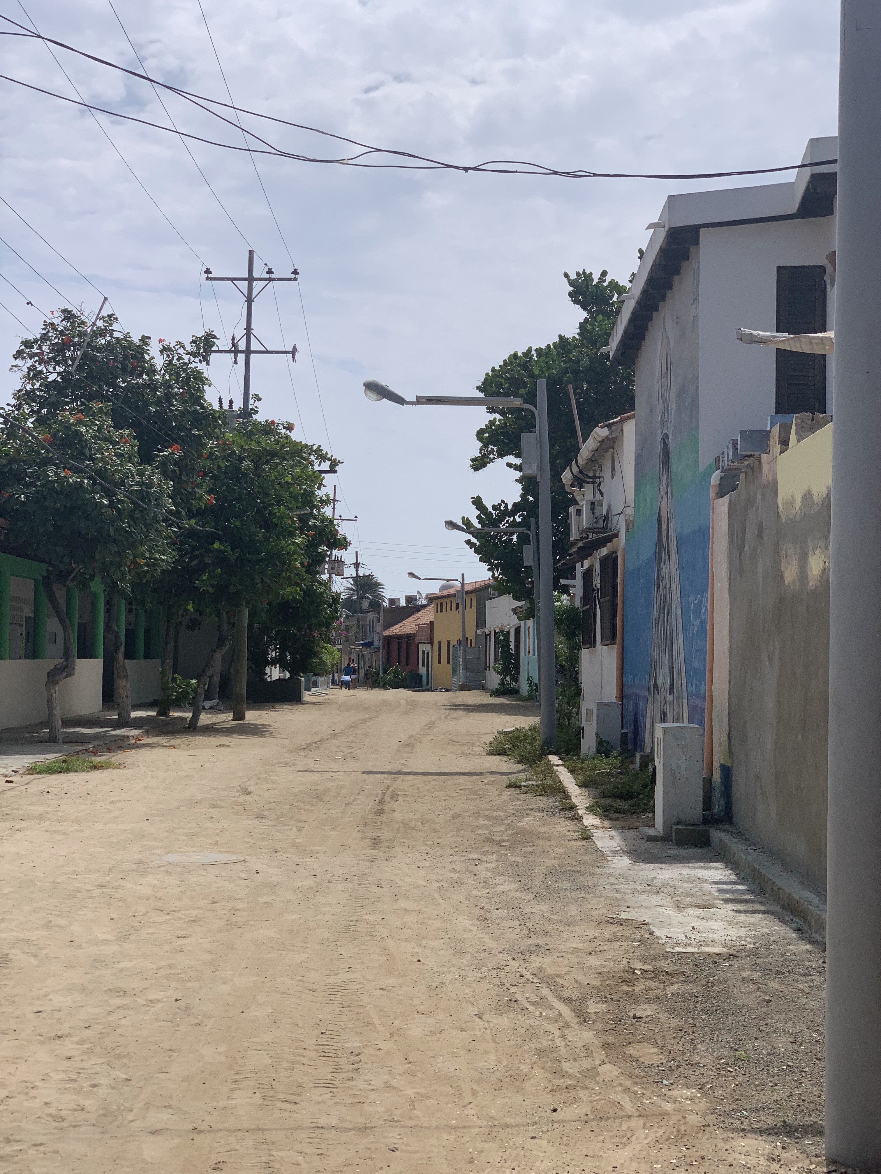Wenn man durch das Dorf spaziert, geht man ausschließlich auf Sandstraßen, Autos gibt es keine. Im Nordwesten der Insel ist das „Industriegebiet“, dort legt das Versorgungsschiff ca einmal pro Woche an einem einfachen Pier an, während sein Heck von der Küstenwache an einer Boje festgemacht wird. Die Dorfbewohner holen „ihre“ Sachen direkt von dort ab, entweder tragen sie sie einfach, manchmal ziehen und schieben sie aber auch zu viert oder fünft eine Art Wagen, an dem man bei uns Pferde einspannen würde. Im Industriegebiet ist auch ein Tanklager, Treibstoff wird primär zur Stromerzeugung und für die Motoren der Fischer- und Ausflugsboote benötigt. Für letztere wird er dann schon mal im Kanister auf einer Sackrodel über die Sandstraßen gebracht. Für die Stromerzeugung stehen ein paar Containertrailer rum, in denen Generatoren schnurren. Strom gibt es aber nur für ein paar Stunden am Tag, weswegen insbesondere die Unterkünfte eigene kleinere Generatoren haben. Wir erfahren von Oscar, einem Einheimischen, der in Kindheitstagen 10 Jahre in den USA gelebt hat und daher fließend Englisch spricht, dass es die Venezolaner mit Wartung nicht so haben. Die Generatoren werden genutzt, vielleicht hin und wieder bissl was gemacht, aber wenn sie kaputt sind hofft man auf Neue. So stehen auch einige alte herum. Im Industriegebiet steht auch die Entsalzungsanlage für das Trinkwasser der Insel und direkt im hinteren Teil ist die Müllhalde, einfach ein Flecken Erde auf das der Müll kommt, seit Jahrzehnten, offensichtlich.