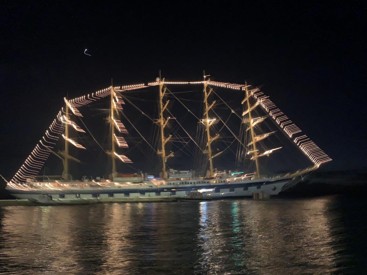 Her favorite cruise ship was the Royal Clipper, a five-masted fully rigged tall ship. Her design was based on the Preussen, a famous German five-mast windjammer from 1902. With 5,202 square metres of sail, she is the largest square-rigged ship in service and can carry up to 227 passengers. If she ever considers a luxury cruise, this is the ship to go. The Royal Clipper left Bonaire at night under sail. What an impressive sight!