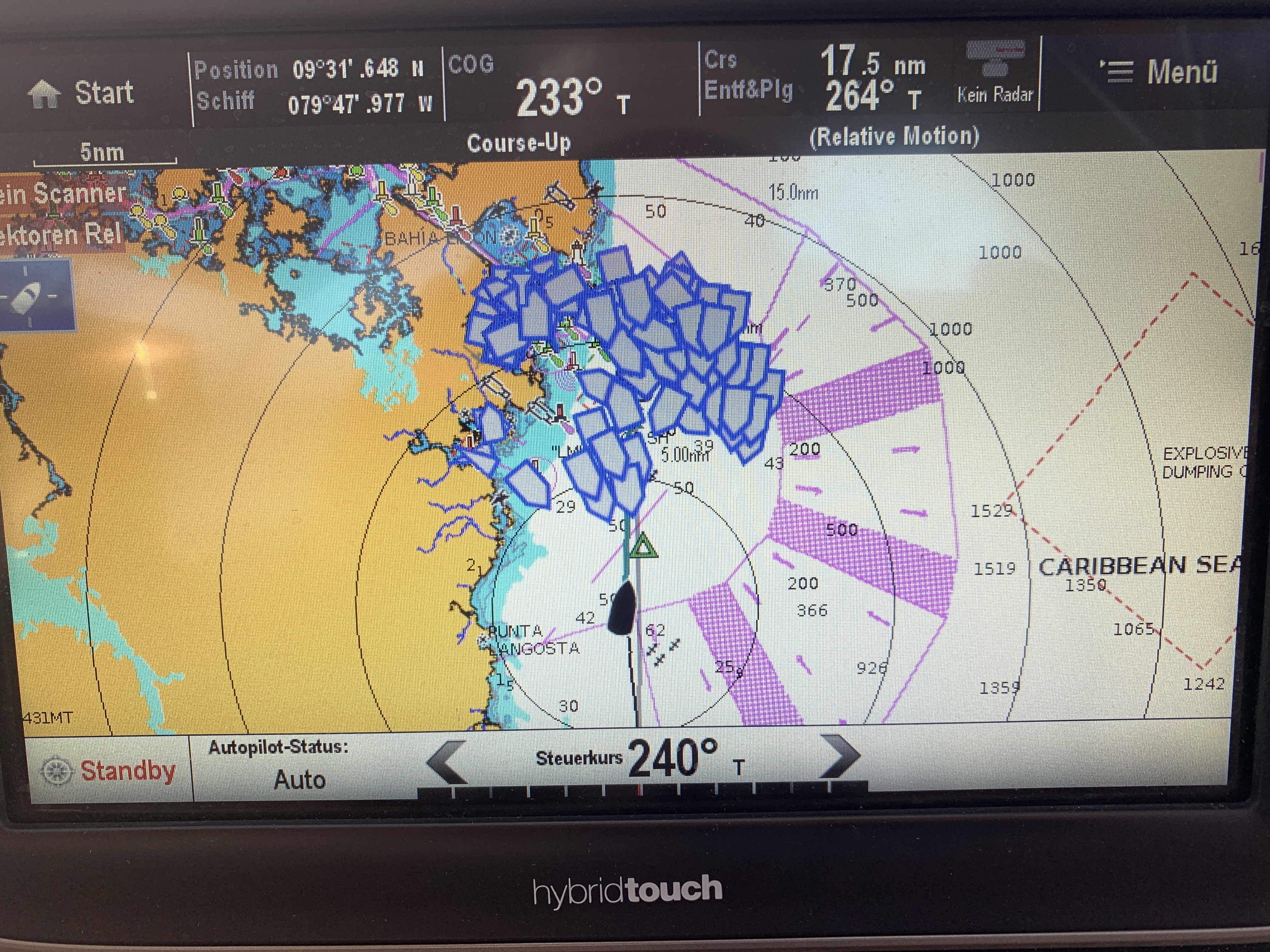 Eigentlich war der Plan Sylvester auf hoher See zu feiern, so legen wir jedenfalls unsere Abfahrt in Santa Marta Kolumbien an. Nach der Passage von Bonaire nach Santa Marta, hat uns auch noch der erste Tag des Wegsegelns von Santa Marta einiges abverlangt. Vor allem die Wellen waren recht hoch und das mit kurzer Periode, Wind bis 35kt. Nach dem ersten Tag hat sich das aber gelegt und es wurde noch eine recht entspannte Passage. Allein es gab dann mehr Wind als vorhergesagt und schon standen wir am Sylvesternachmittag etwas im „Stau“: Die Zufahrt zur Shelter Bay Marina in Panama ist gleichzeitig auch die Atlantikseitige Zufahrt zum Panamakanal, mit geregeltem Verkehr für die Frachtschiffe (auf gut nautisch „Verkehrstrennungsgebiete“, für den Laien: es gibt da Richtungsfahrbahnen, siehe auch das folgende Foto wie das auf der Seekarte aussieht) und einem riesigen Ankerfeld mit Frachtern, die auf ihre Kanaldurchfahrt warten. Die Herausforderung für uns: Wir sehen die Frachter zwar alle per AIS am Plotter, auf einen schnellen Blick ist aber nicht erkennbar ob die tatsächlich alle Ankern oder doch der eine oder andere in Bewegung ist. Obendrein kommen wir in die Dunkelheit, das macht das ganze nochmal spannender. Mit entsprechender Konzentration geht es durch das Ankerfeld, neben dem betonnten Kanal bis zur Molendurchfahrt und dann hinter einem Frachter schnell da durch (für diese Durchfahrt muss man sich per Funk anmelden) und danach gleich scharf rechts abgebogen, raus aus dem ganzen Frachterverkehr, hinein in die von Dschungel umgebene Marina. Um 20Uhr legen wir an, um uns dabei zu helfen unterbrechen sogar die lokalen Dockhands ihren Sylvesterschmaus, vielen Dank nochmal hierfür. Im Marina Restaurant gab es dann tatsächlich kurzfristig auch noch Platz und ein Sylvestermenu für uns.