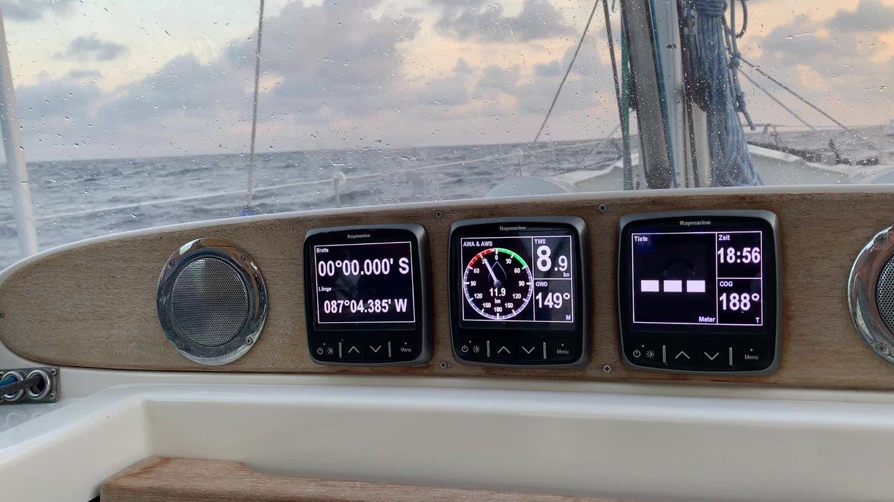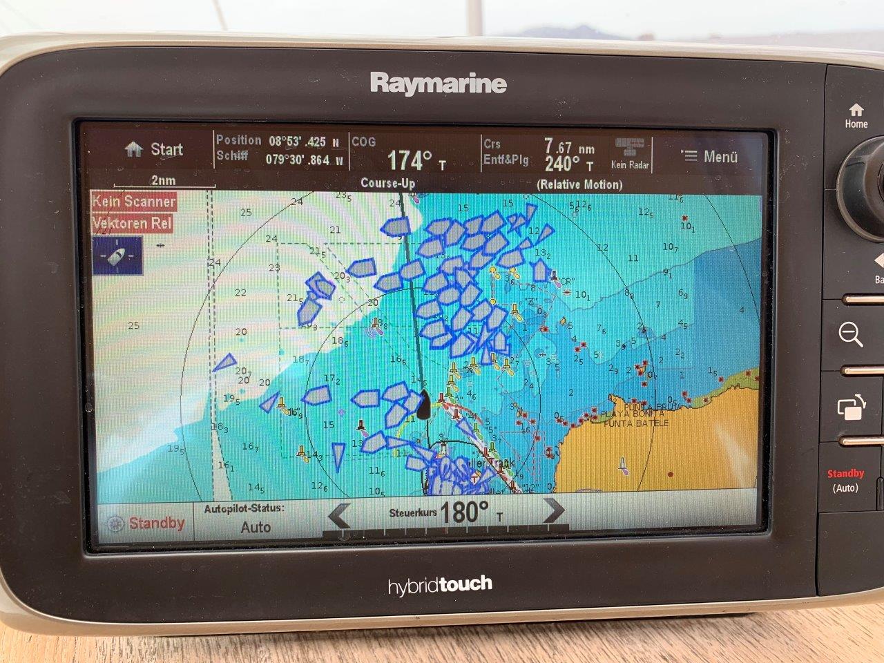 1000 Hoists Code 0, but even a close reach brings her rather WNW than SW. Experiments with different sail set-ups including Genua. No success. Sailing does not bring her closer to the destination. Quite frustrating. Turns the engine on again with lower rpms than before.
