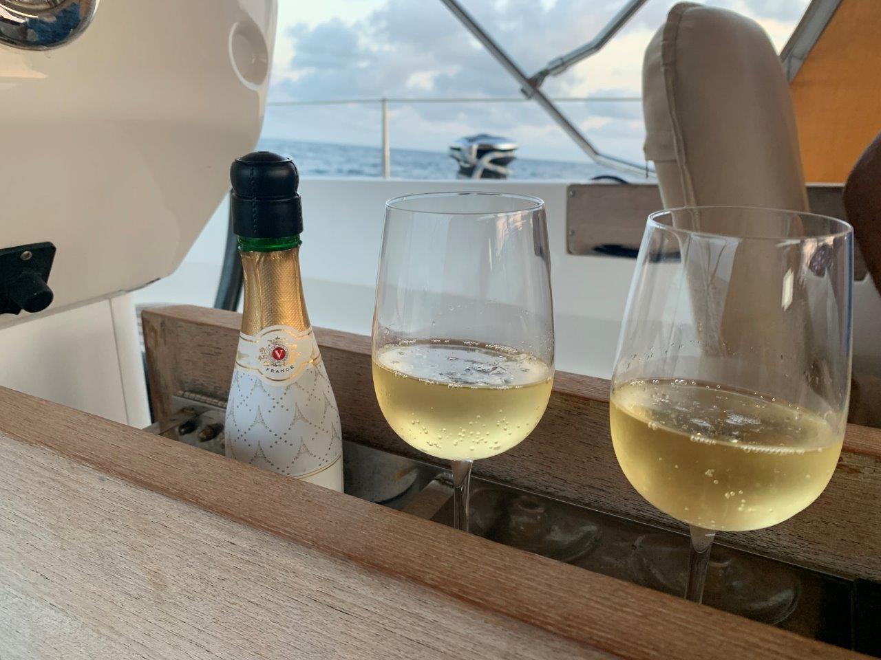 1856 Little Ibex and her crew cross the equator, they celebrate with sparkling wine, and everyone swims around the yacht once. They also offer some alcohol to the sea (not sure if to Poseidon and / or Neptune).