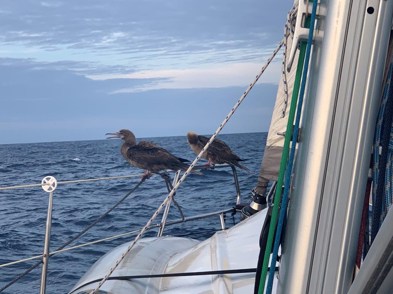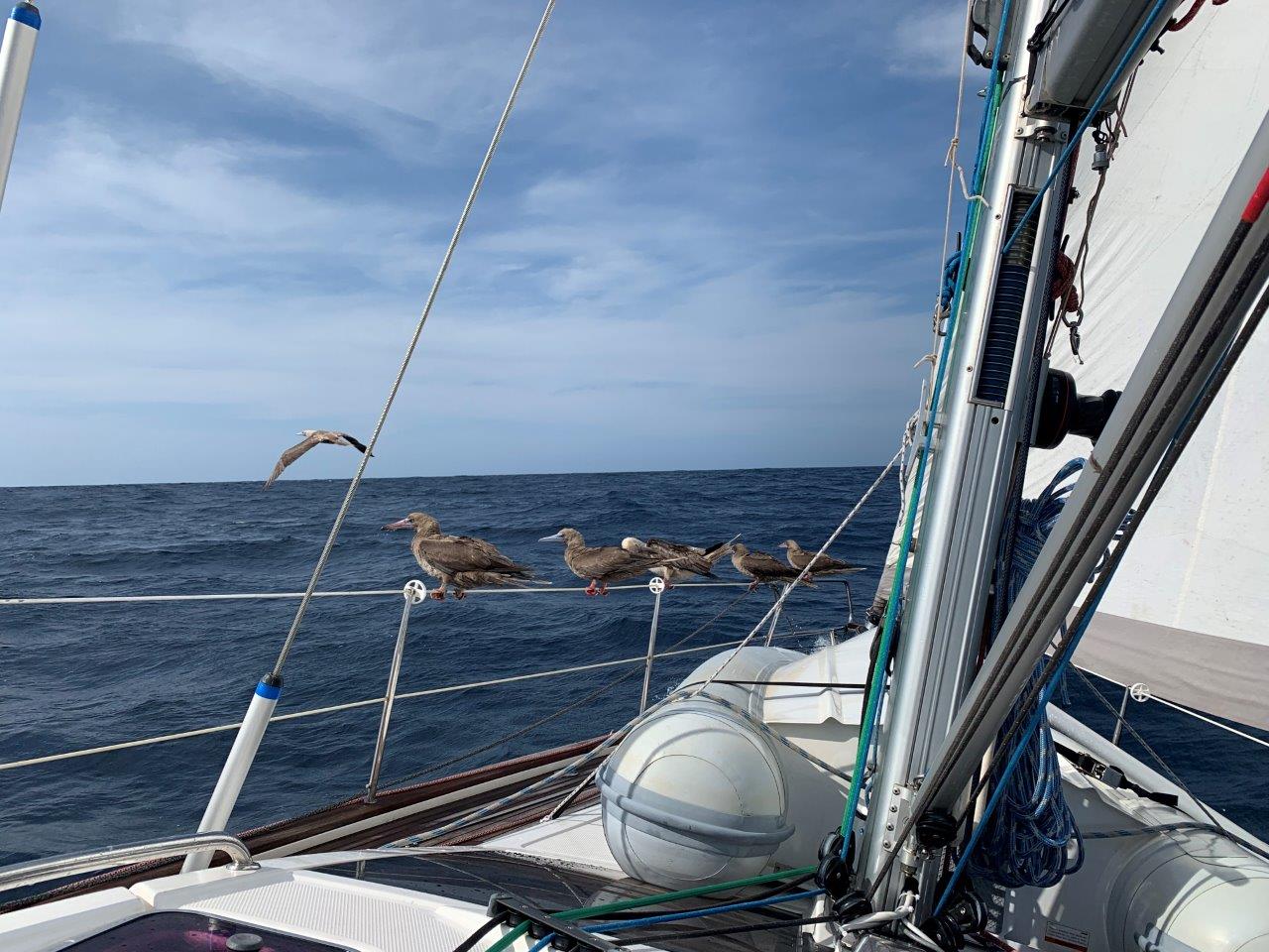 1500 A group of birds sits on our windward rail guard. They seem to enjoy the ride.