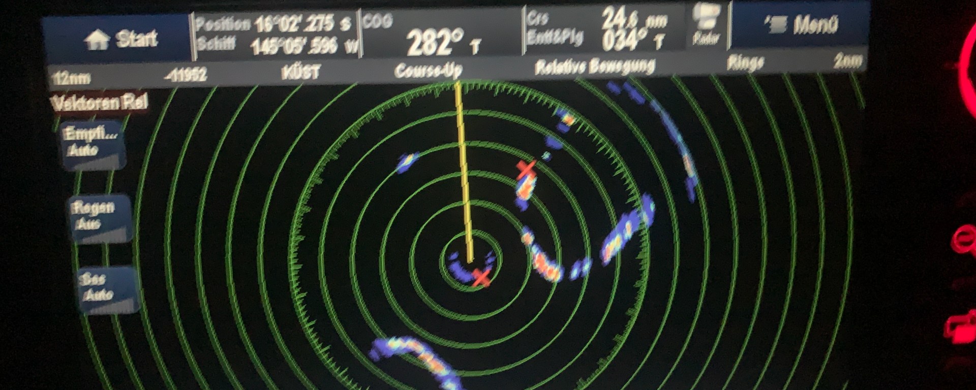 Zum einen muss man aber erst mal wissen wo genau die Atolle sind. Durch die sehr niedrige Landmasse sind sie von der Ferne nur sehr schwer auszumachen. Obendrein sind die Seekarten, egal ob auf Papier oder elektronisch für dieses Gebiet nicht zu 100% zuverlässig und genau. Insofern kommt da als erstes das Radar intensiver dran. Denn dieses kann das Land, aber auch insbesondere, die sich davor brechenden Wellen ganz gut erkennen, wenn man es richtig einstellt.