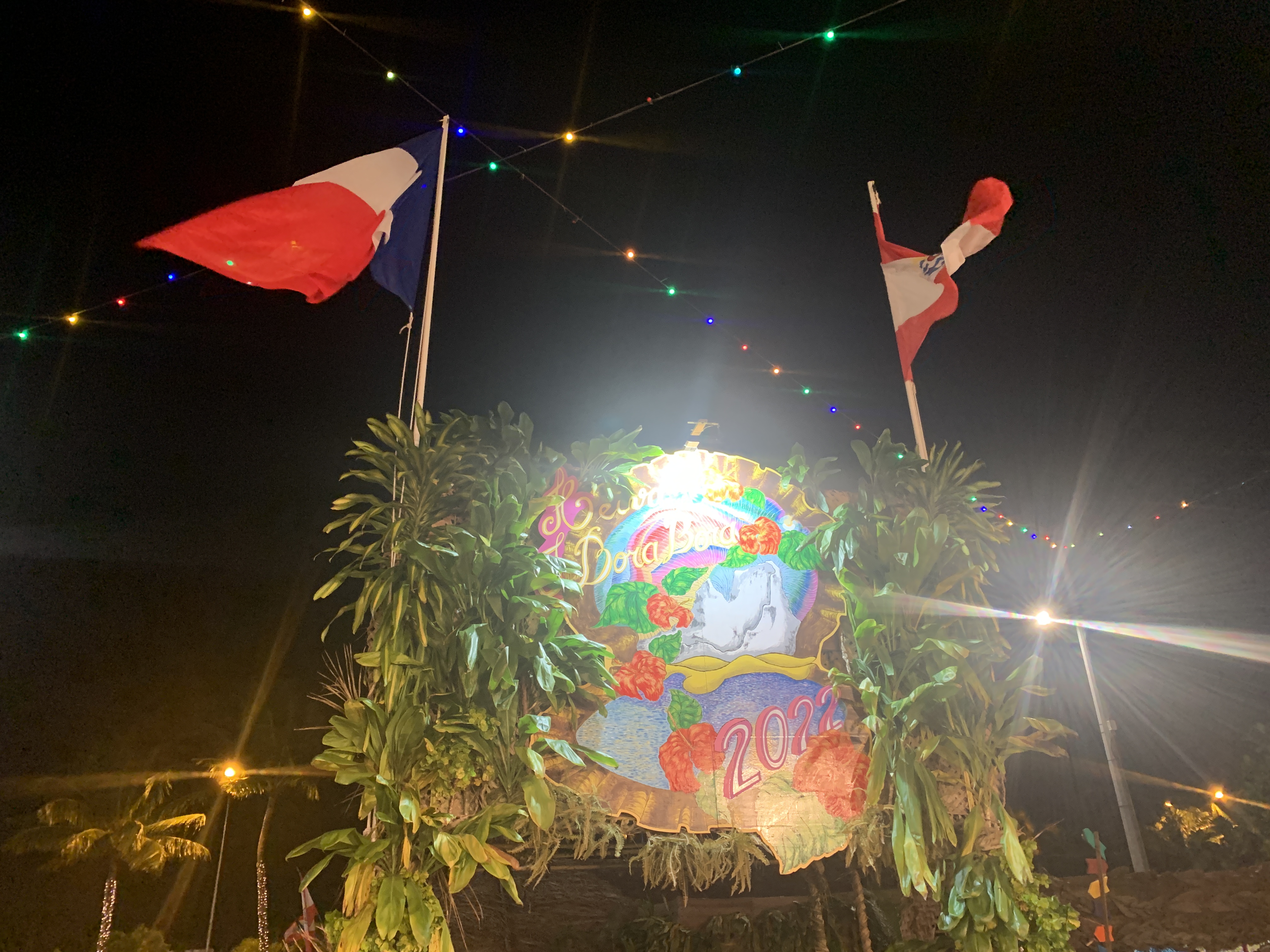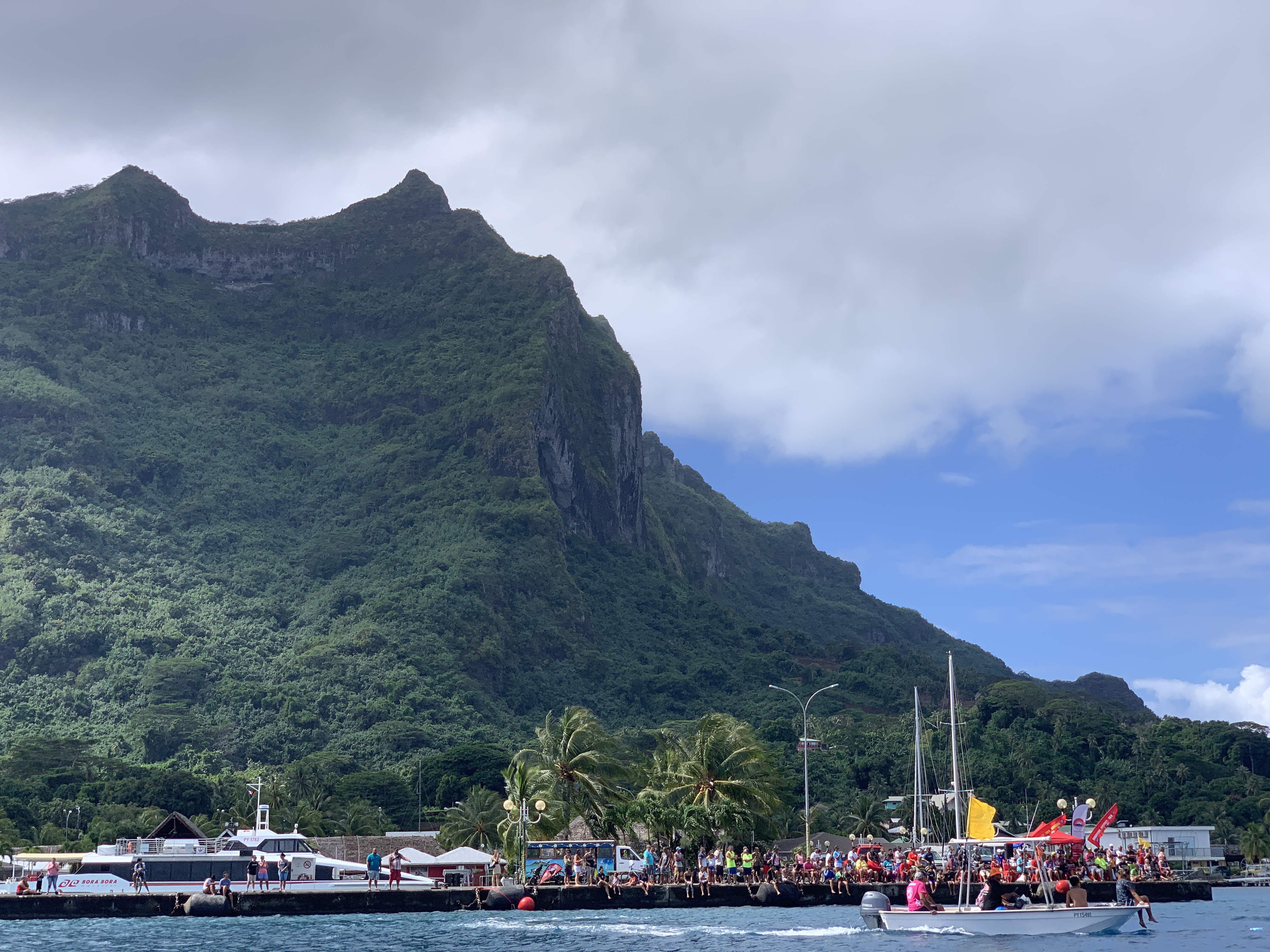 Erst mal benötigen wir eine Boje in der Lagune von Bora Bora, das vollständig von einem Riff umgeben ist und daher auch die berühmte Form hat, die Bora Bora für Touristen so anziehend macht. Ankern ist in der Lagune für Boote unserer Größe verboten. Das bringt eine etwas längere und wegen Wellen raue Dinghyfahrt nach Vaitape mit sich, der wesentlichen Siedlung auf der Insel. Nichtsdestotrotz erkunden wir gleich am ersten Abend Vaitape und das Festivalgelände. Nebst dem zentralen Sandplatz für die Tänze mit Tribune, sind Freß- und Spielbuden aufgebaut. Letzteres letztendlich wie man es auch von Volksfesten bei uns kennt, nur dass die meisten Spielbuden selbst gebastelte Spiele bieten. Insofern ist da auch viel einfach mit Holz und Karton gebaut, was dem Spielspaß aber keinen Abbruch tut.