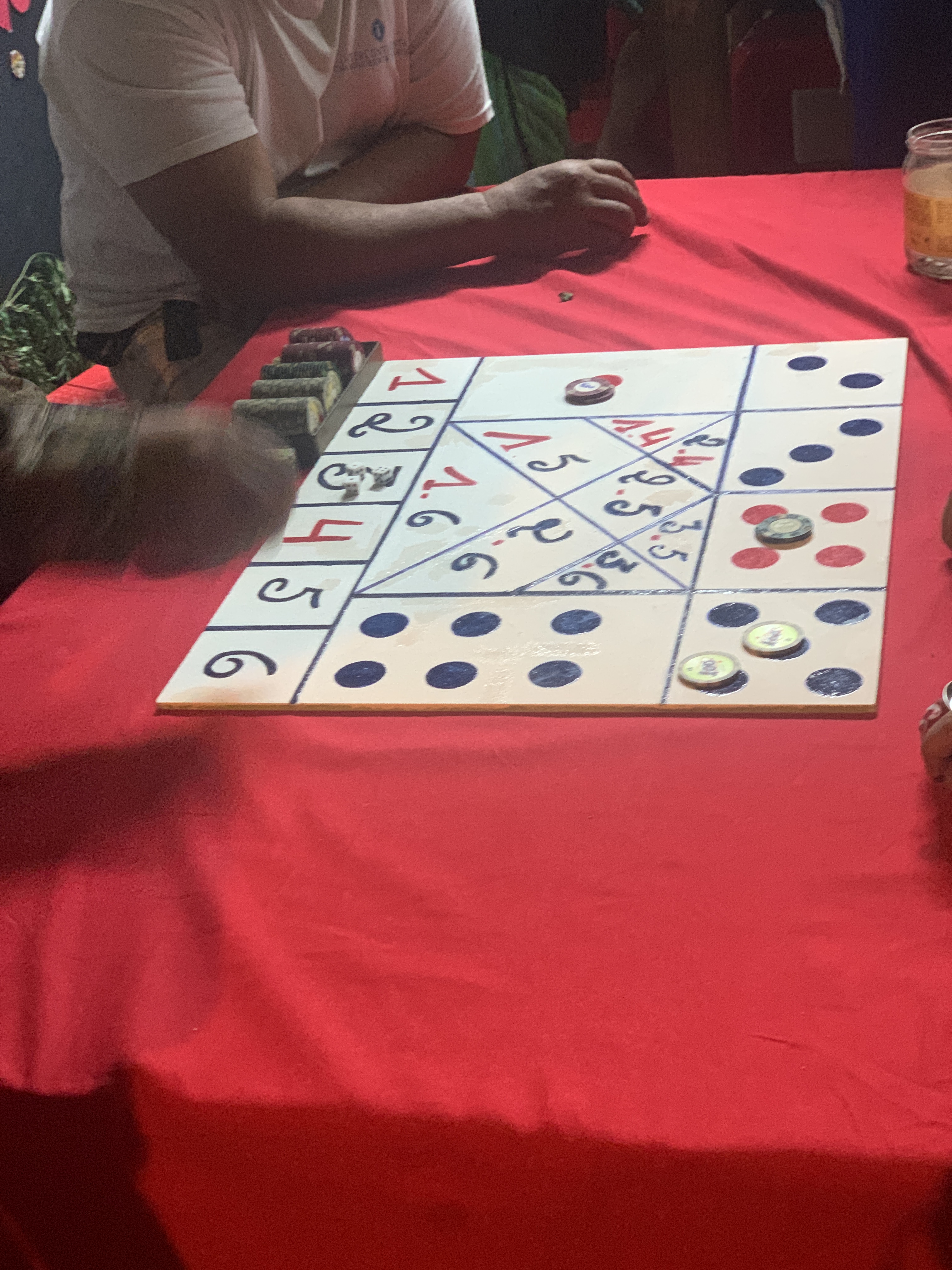 An einem anderen Tag stoßen wir recht zufällig aufs Kokosnuss Speerwerfen. Hierfür wird eine Kokosnuss auf einem ca 8m langen Stab montiert und dieser dann aufgestellt und mit Seilen wie eine Zeltstange fixiert. Aus vorgegebenen Abstand haben die Kontestanten nun die Möglichkeit innerhalb vorgegebener Zeit ihre jeweils ca 10 selbstgebastelten Speere auf die Kokosnuss zu werfen. Es gibt Punkte für jeden Treffer und Zusatzpunkte für den zeitlich ersten und den räumlich höchsten Treffer. Die Mehrzahl der Speere trifft natürlich nicht, was zu einem interessanten Bild hinter der Zielkokosnuss führt.