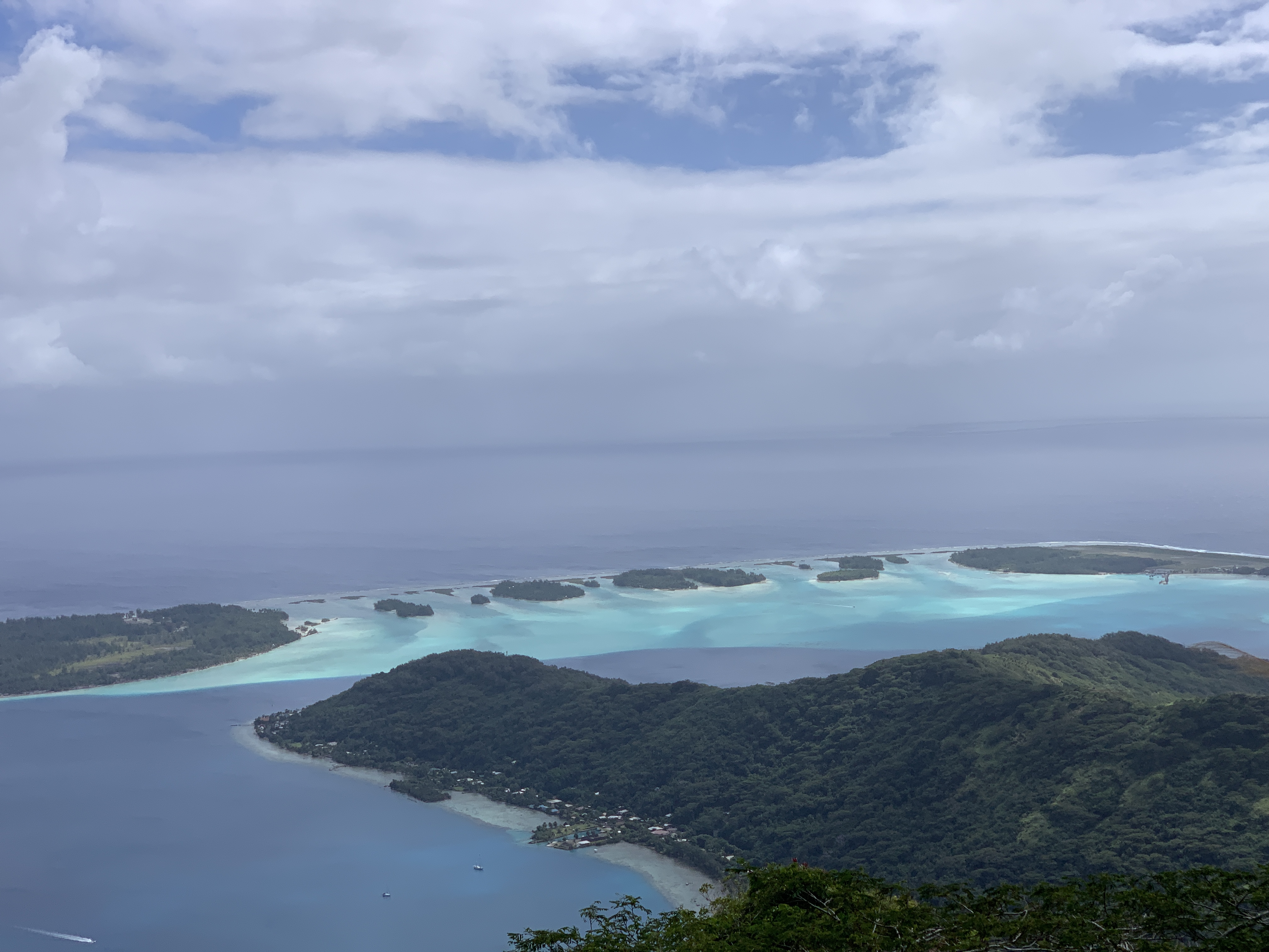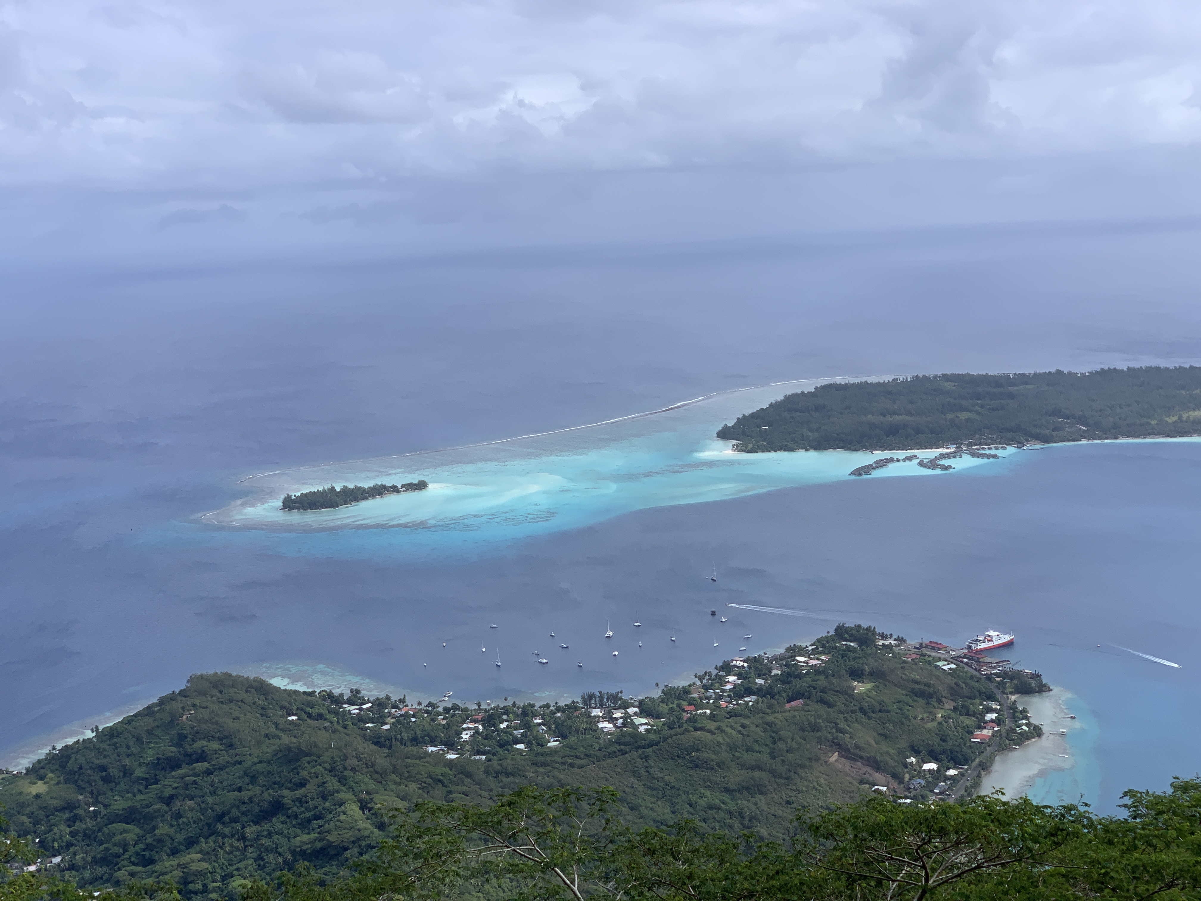 Für einen guten Ausblick auf Bora Bora und das Riff rundum, versuchen wir an einen der höchsten Punkte der Insel zu gelangen. Gar kein so einfaches Unterfangen, denn Wanderwege oder geschweige denn eine Beschilderung oder Markierungen gibt es hier nicht. Nach dem einen oder anderen Irrweg auf einem Tierweg im Dschungel, schaffen wir es auch auf den zweithöchsten Punkt der Insel (der höchste ist ein Fels und wäre nur per alpinkletterei zu erreichen). Der Ausblick belohnt die Mühen, auch wenn wir bergab dann den Weg nochmal verlieren und ganz woanders an der Küste herauskommen, als dort wo unser Boot steht.
