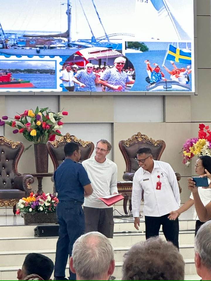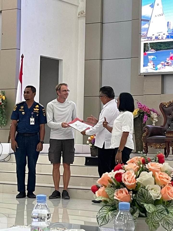 Zur Verabschiedung gibt es noch die indonesischen Bootsdokumente überreicht, für uns eine recht formelle Zeremonie mit dem Chef Hafenmeister der Kei Inseln und Vertretern der Regionalregierung.