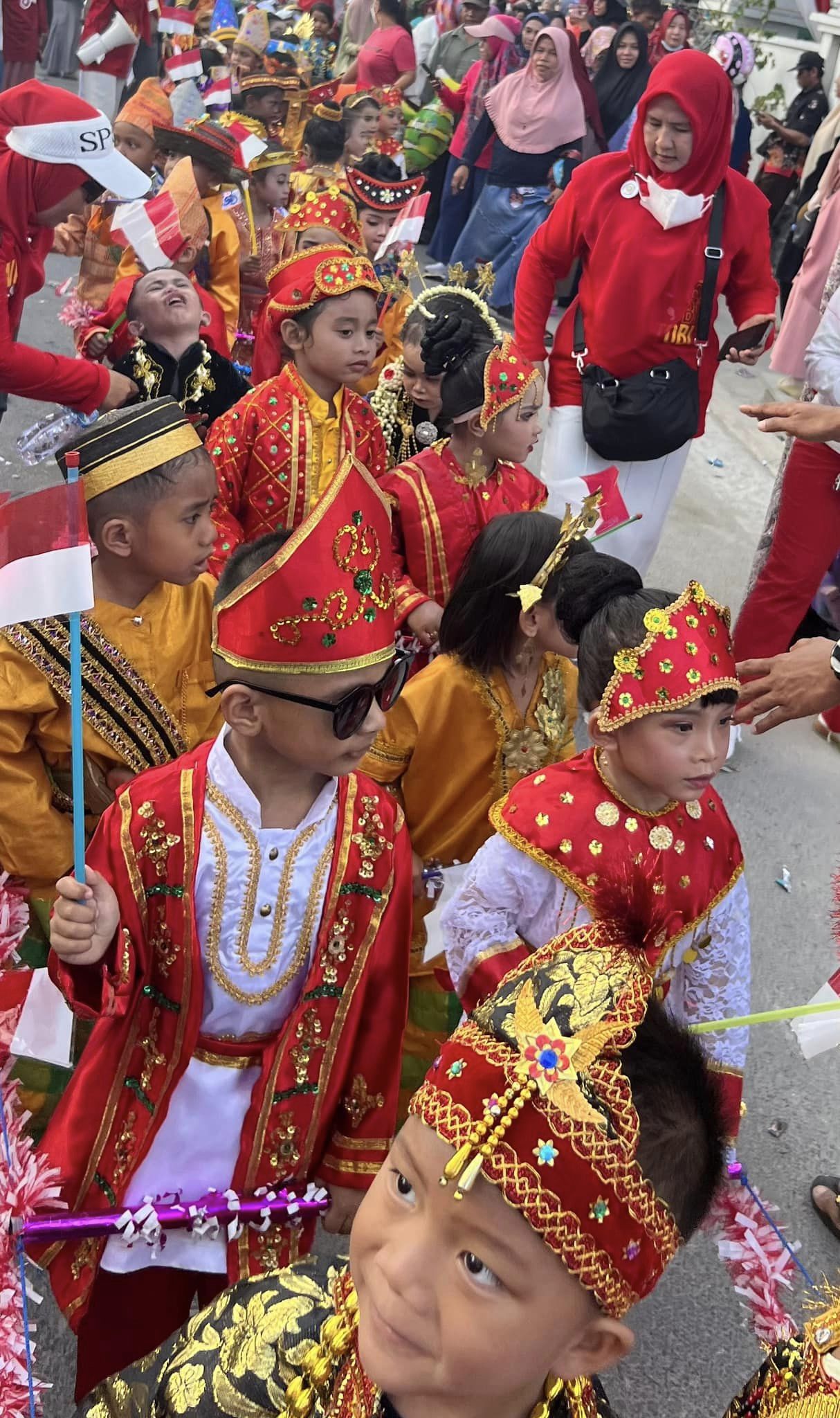Während wir uns gedanklich bereits mit der Weiterreise beschäftigen erfahren wir von einem einheimischen Mädl, dass heute die Feierlichkeiten zum Unabhängigkeitstag mit der Parade der Kinder beginnen. Wir wussten natürlich grundsätzlich von diesem in Indonesien sehr wichtigen Tag und hatten auch schon überlegt wo wir hierfür sein wollen. Hatten aber keine Ahnung von der Größe der Feierlichkeiten. Nun, Kinderparade, ist ja möglicherweise ganz nett, lass mal hinschauen, sind auch nur zu Fuß 15 Minuten zu jenem zentralen Platz, der aktuell Baustelle ist.