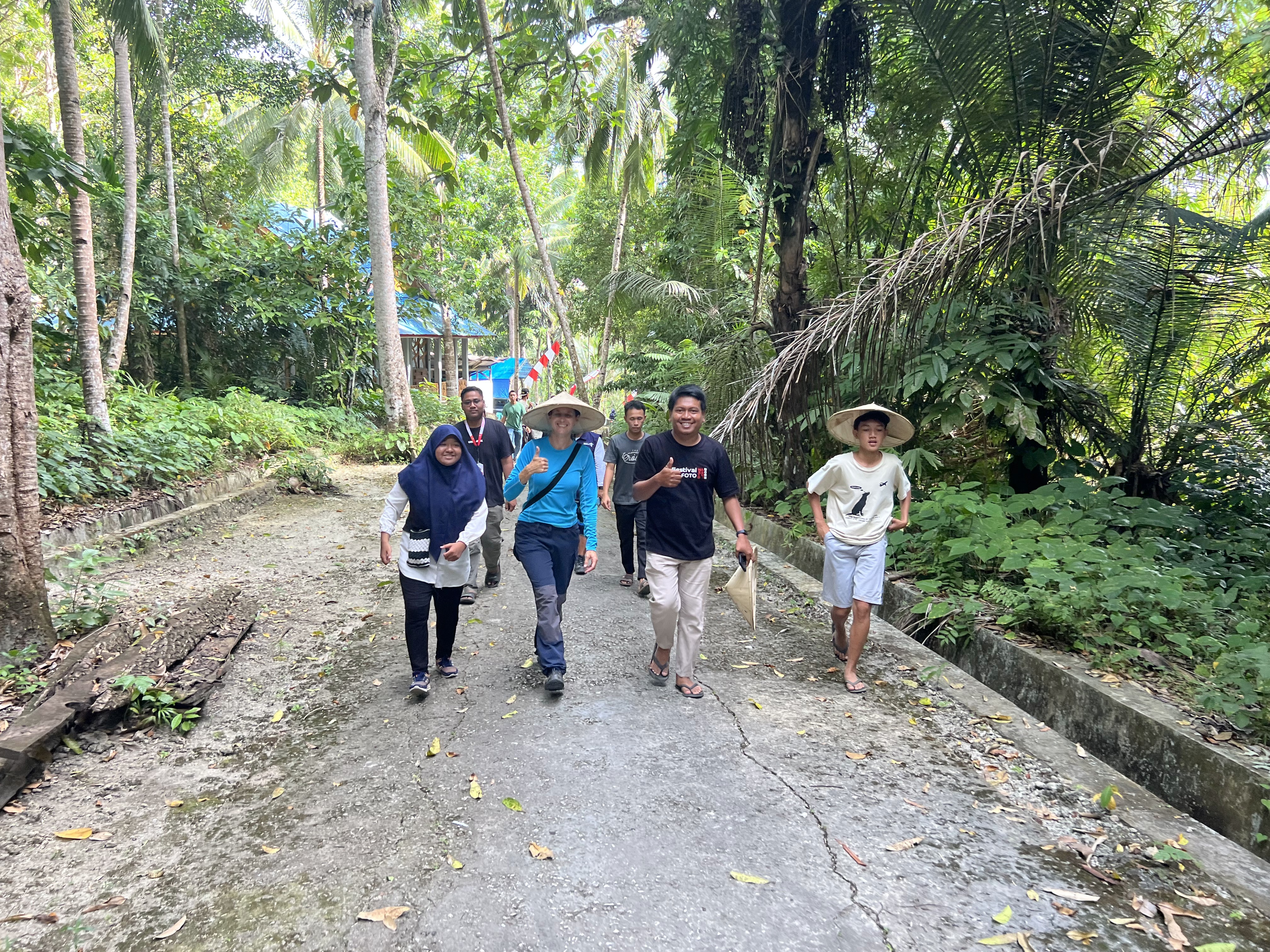 Also rauf in die Berge, rein in den Dschungel. Bei einer Art Bürgerhaus eines Dorfes wird das Auto abgestellt, und wir lernen einen lokalen Guide kennen, der uns weiter bringen wird. Allerdings nicht ohne einer Entourage von lokalen Persönlichkeiten und ein paar Kindern. Wir wissen nach wie vor nicht was uns erwartet, kommen aber bald zu einem Dorf, das recht nett im Dschungel liegt. Erfahren dann, allerdings, dass es sich hierbei noch nicht um das heilige Dorf handelt. Es stößt ein weiterer lokaler Guide und ein paar Leute mehr zu uns. Die „Wandergruppe“ wird immer größer, wir beiden sind allerdings die einzigen Gäste, der Rest sind alles Einheimische. Wir kommen wieder in ein Dorf, und die Sache soll sich wiederholen. Wir werden also noch mehr Leute. Allerdings scheint es hier etwas ernster zu werden: zum einen dürfen wir ab hier nichts Rotes mehr sichtbar tragen (man hat uns vorab bereits darauf hingewisen nichts Rotes anzuhaben), denn rot ist eine heilige Farbe in de heiligen Dorf. Darüber hinaus, dürfen Frauen ab hier nur außerhalb der Menstruation weiter (ja, Vicky wurde diesbzgl. sehr direkt befragt). Und ab hier ist es kein breiter Weg mehr, sonder ein schmaler Trampelpfad im Dschungel. Wir wandern nochmal 15 Minuten in bergigeres Gebiet und kommen zu einem 100e Jahre alten Grab. Hier sollen wir nun warten, während der zuletzt dazugestoßene Guide alleine ins heilige Dorf vorgeht. Er muss jetzt dort mit den Älteren sprechen, und diese müssen die Geister befragen, ob jetzt auch ein guter Zeitpunkt ist Touristen ins Dorf zu lassen. Nachdem sich also die größte Neugier in uns aufgebaut hat, kommt der Guide zurück und vermeldet was die Geister gesagt haben: Nein, heute leider nicht.