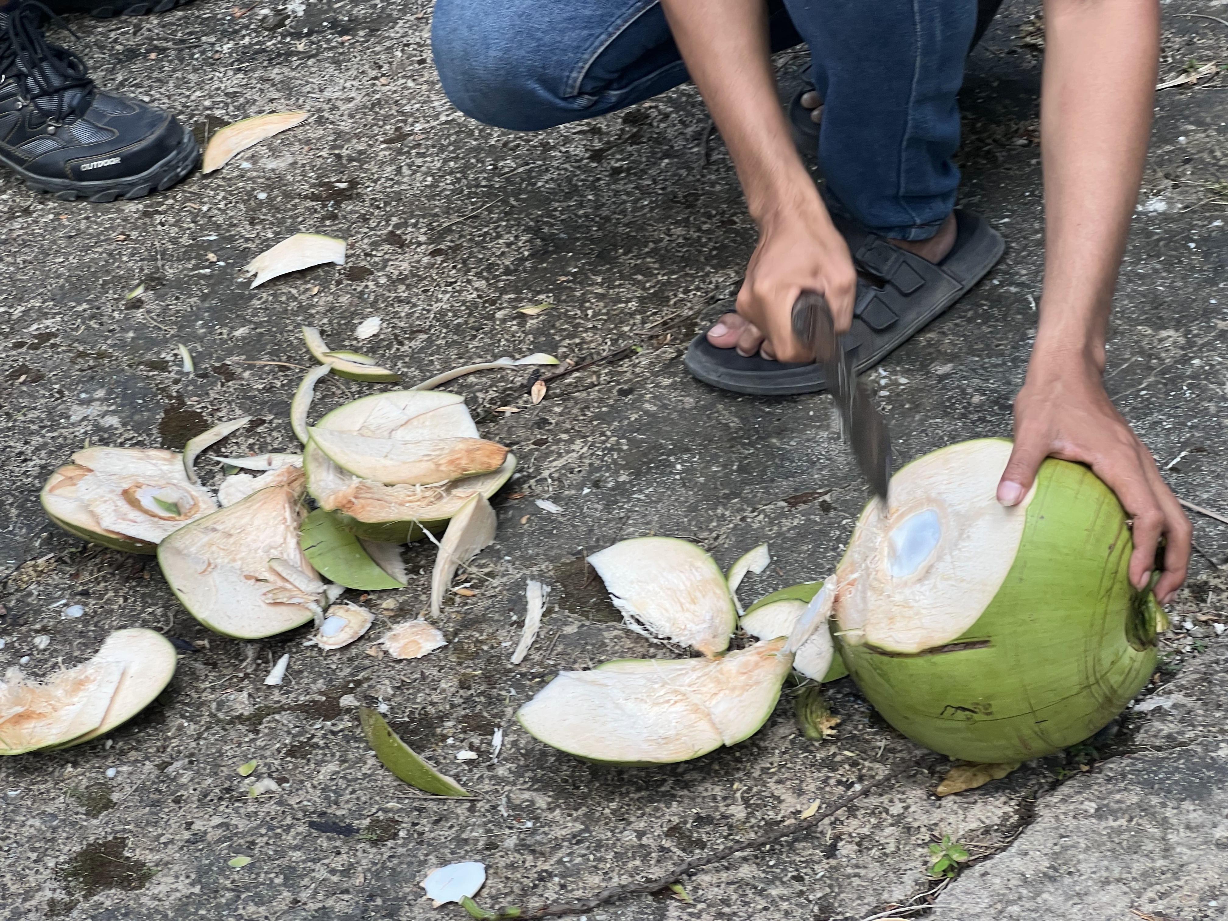 Als Entschädigung steigt ein Local barfuß auf eine Palme und holt uns einige Kokusnüsse herunter. Frisch sind die natürlich am besten. Und zurück am Ausgangspunkt lernen wir noch die Ladies kennen, die die Bambushüte per Hand fertigen.