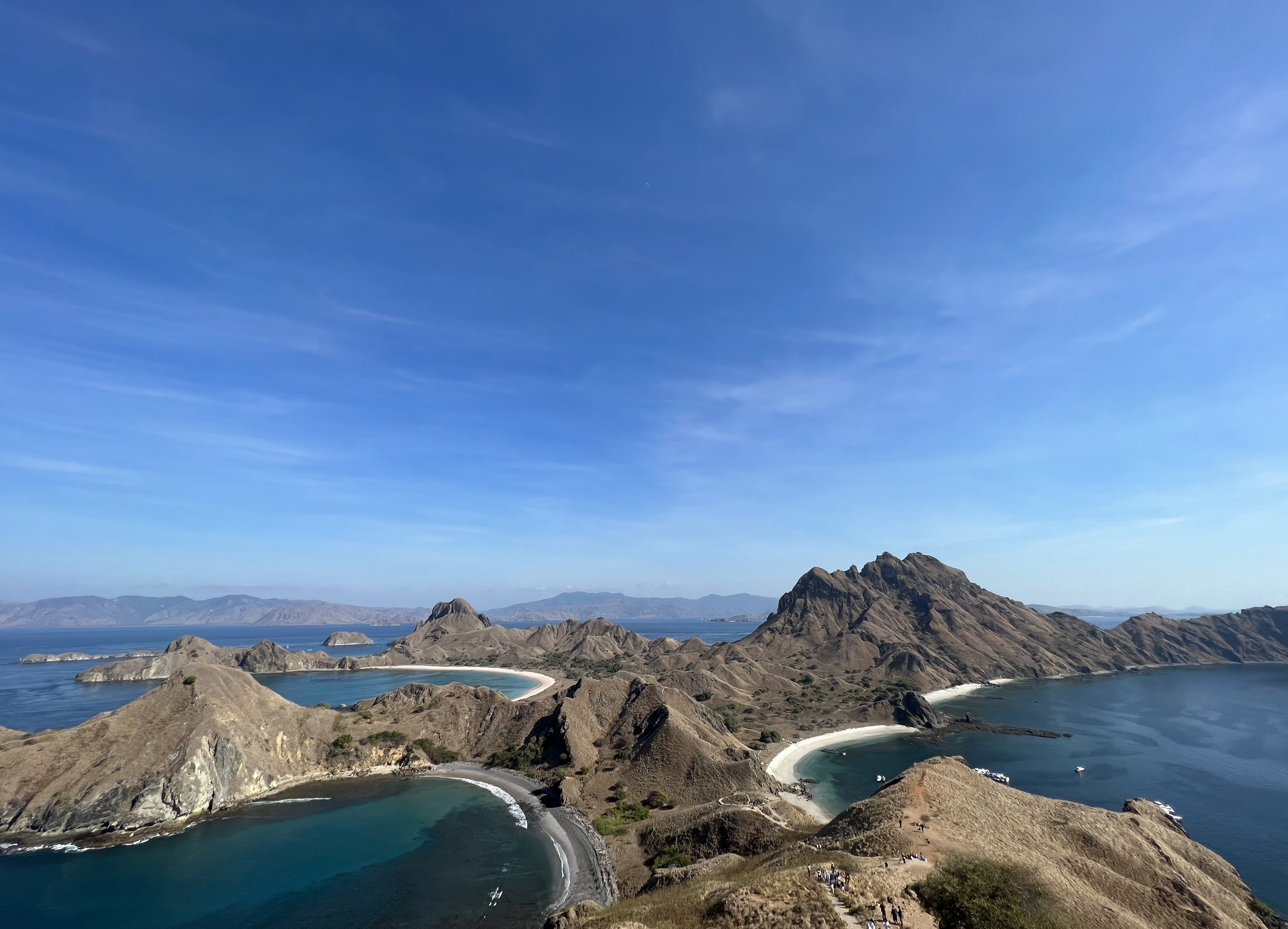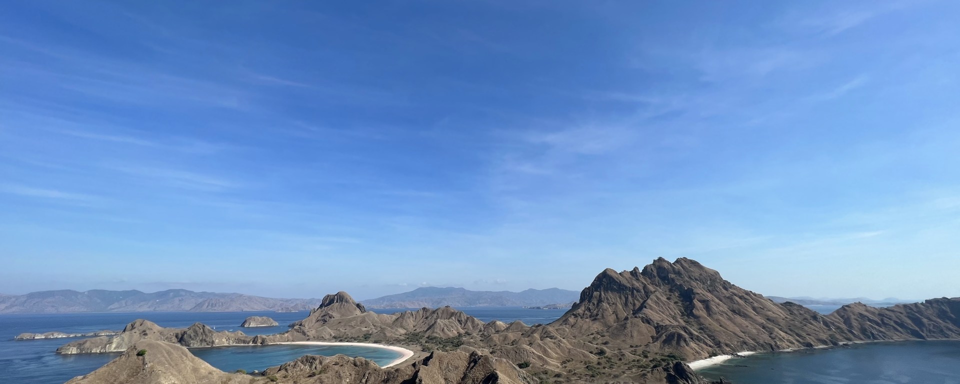Berühmt in Komodo ist auch der Ausblick im Süden der Insel Padar mit Blick auf die drei Buchten mit Sandstrand. Aber auch der Fernblick von dort oben lohnt sich.