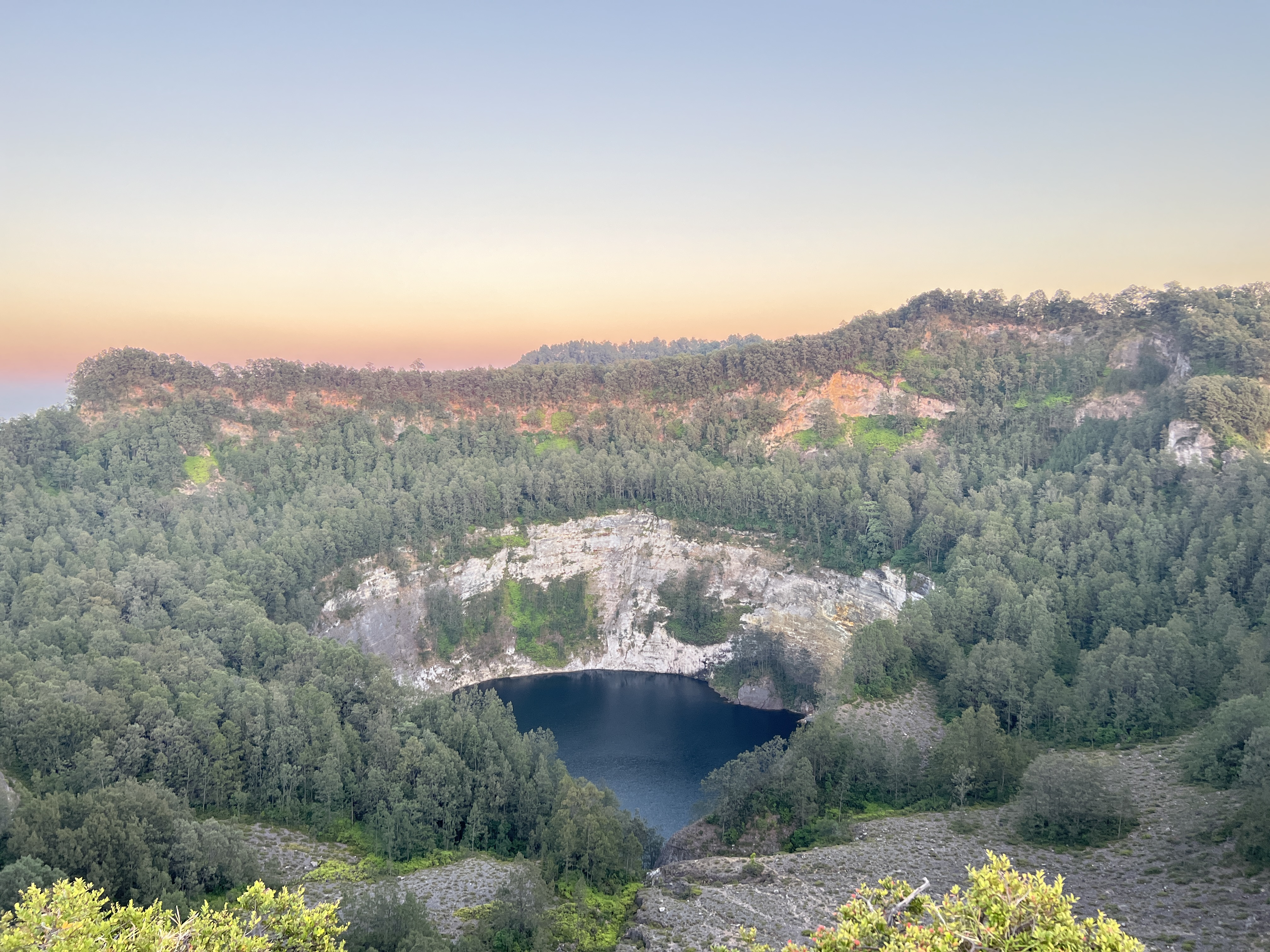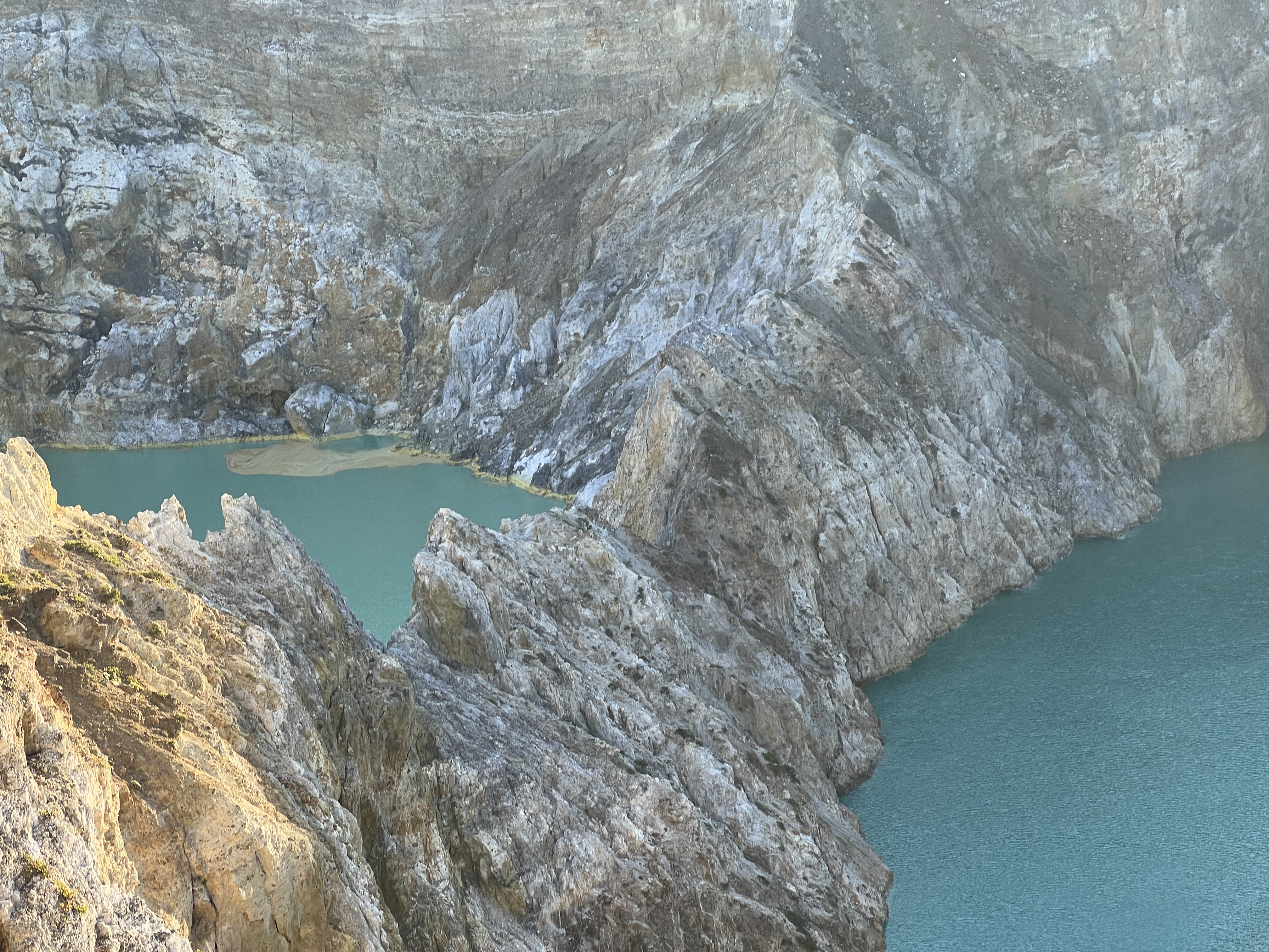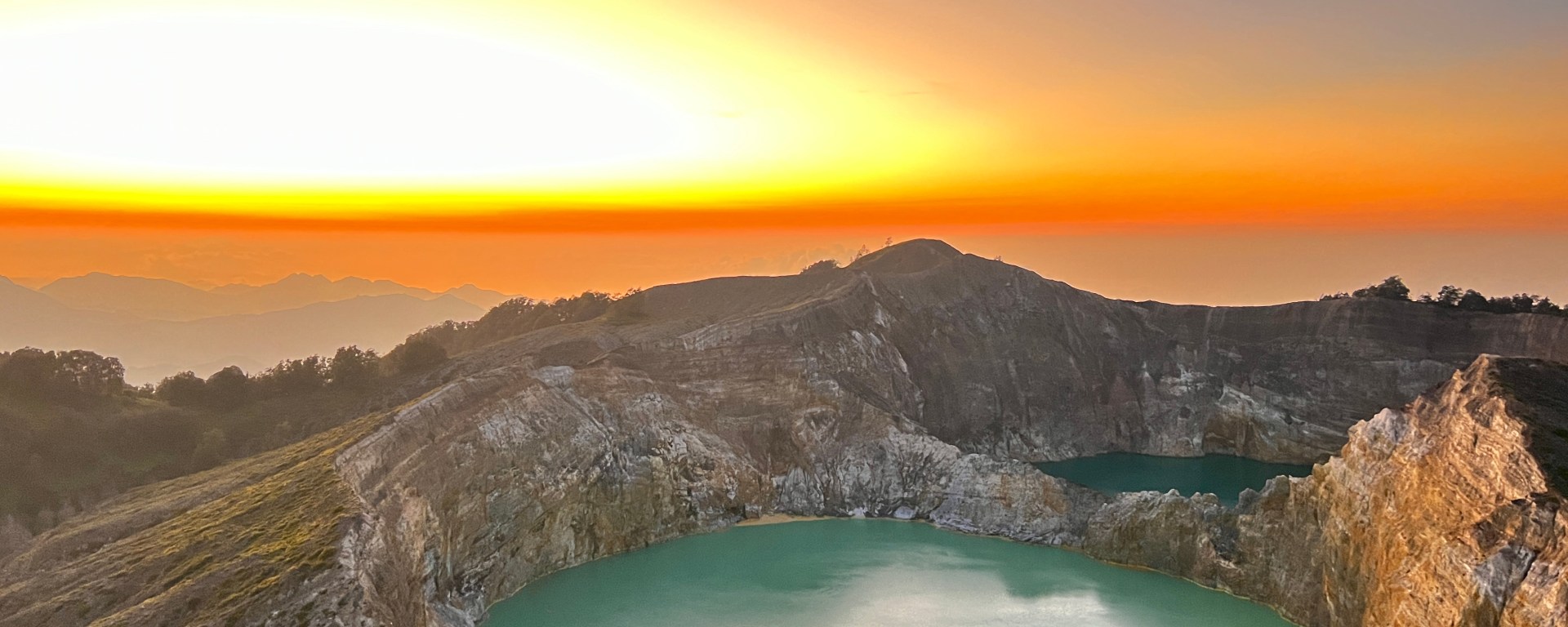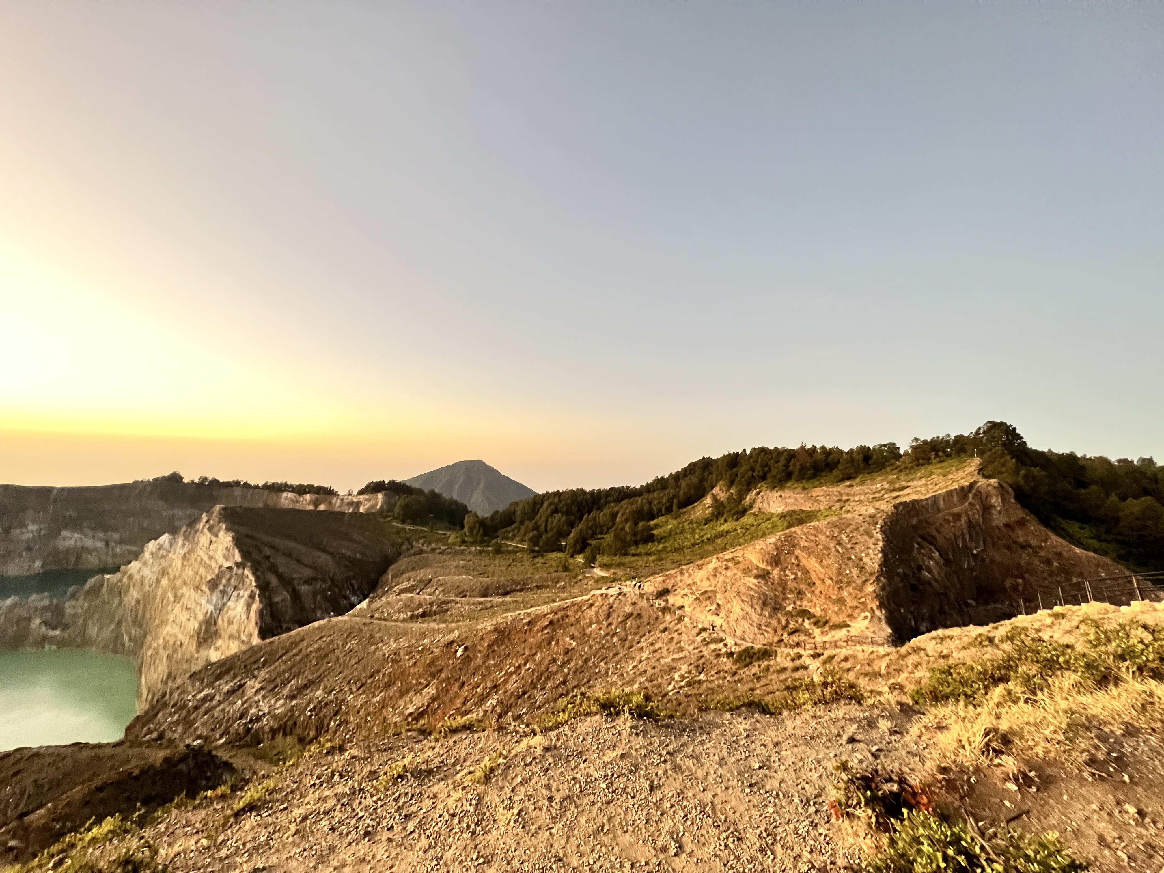 Am nächsten Tag stehen wir bereits vor 4 Uhr auf, denn wir wollen den Sonnenaufgang am Vulkan erleben, da hat man die besten Chancen für eine gute Sicht. Es geht zuerst mit dem Auto auf den Berg rauf, soweit wie möglich und danach zu Fuß weiter. Im ersten Morgengrauen erreichen wir den höchsten Punkt bei den Kraterseen. Es handelt sich um zwei Seen, die direkt nebeneinander sind und vom Aussichtspunkt perfekt betrachtet werden können. Der dritte See ist etwas separat und auf der anderen Seite des Aussichtspunktes. Es ist übrigens auch das erste Mal seit sehr lange, dass wir lange Hosen und Jacken tragen, so früh in der Früh ist es am Berg dann doch recht kühl. Der Sonnenaufgang ist dann ein richtig magisches Erlebnis, auch wenn wir ja tolle Sonnenaufgänge vom Meer gewohnt sind. Die Gesteinsformationen sind in der Tat sensationell.