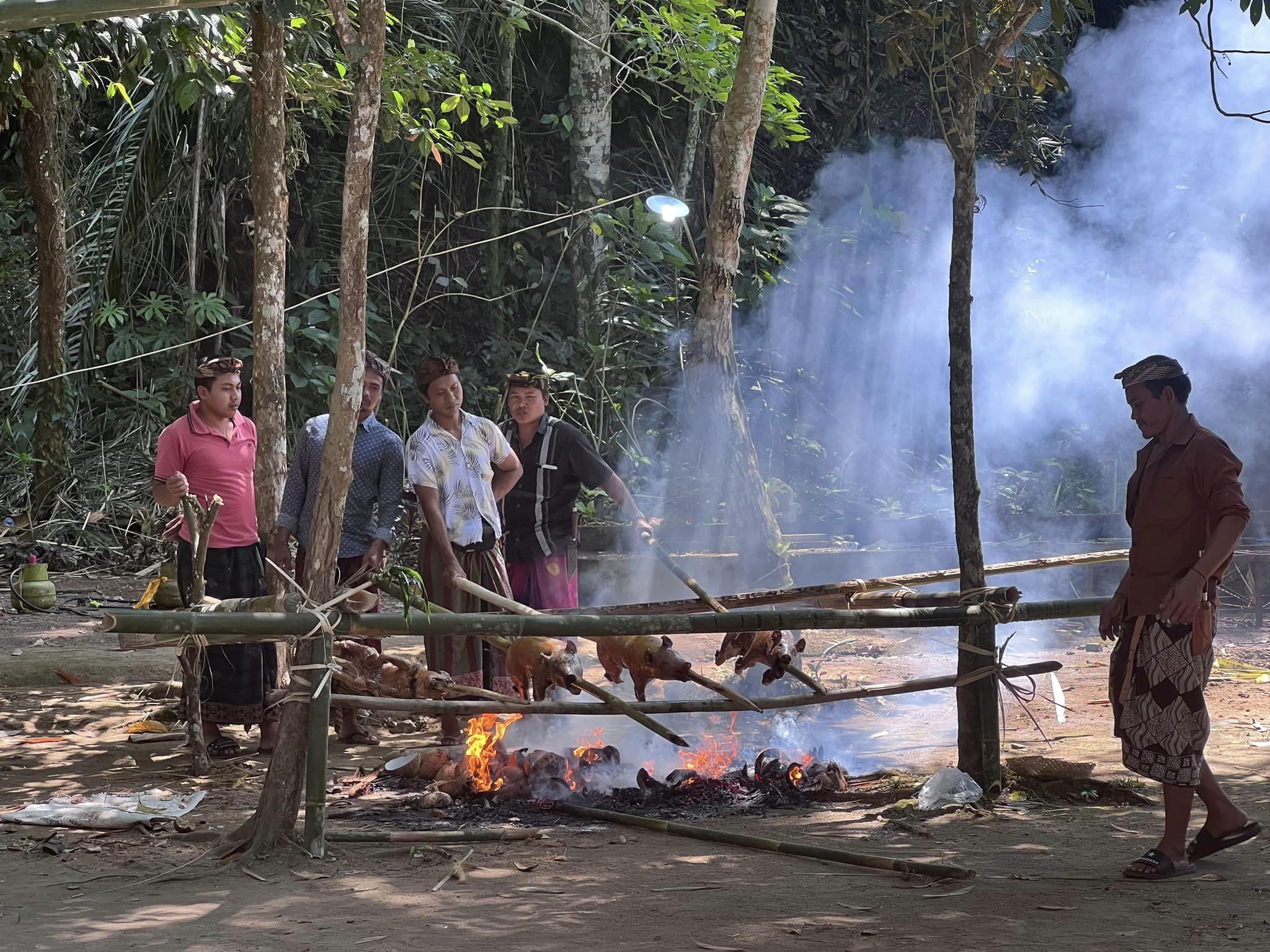 Zurück auf Lombok haben wir die Chance auf eine typische Indonesische Art eines gemeinsamen Essens mit den lokalen Dorfbewohnern. Einige der Dorfbewohner bereiten ein typisch indonesiches Essen für ca 4 Personen zu. Gegessen wird das dann jeweils von 2 Dorfbewohnern und in unserem Fall 2 Seglern, die ihr Boot in der Bucht vor Ort liegen haben. Die Herausforderung dabei: es gibt kein Besteckt. Die Locals sind uns im Essen mit den Fingern / der Hand weit vorraus.
