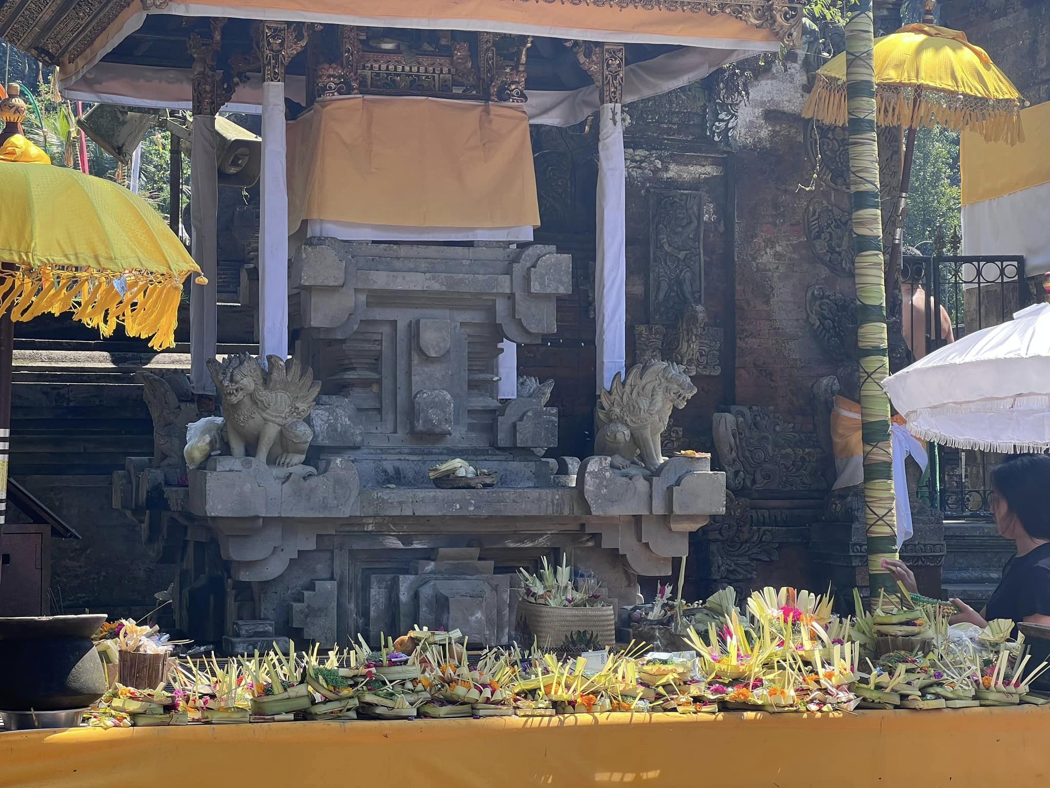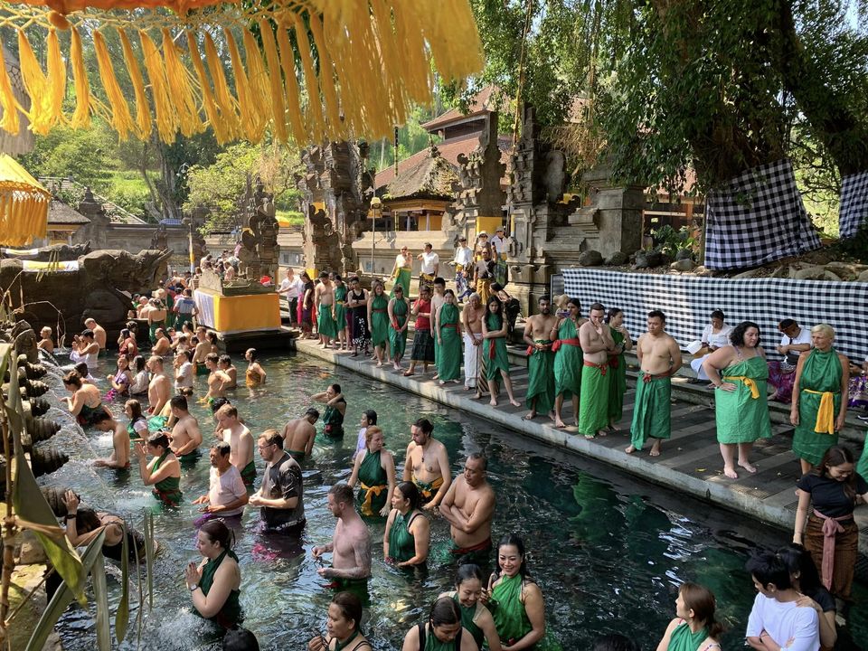 Bali als Insel ist primär hinduistisch, es gibt mehr als 20.000 Hindu Tempel auf der Insel. Kaum schaffbar alle anzusschauen, aber ein paar davon sollten es dann doch sein. Wir stellen auch fest, dass wir zu großen hinduistischen Feierlichkeiten auf der Insel sind, insofern sind die Temple auch sehr stark mit Einheimischen und ihren aktuell laufenden Zeremonien belebt. Als Erstes besuchen wir den Tirta Empul Tempel im Norden von Ubud. Der Tempel ist rund um eine heilige Quelle gebaut. Das Wasser der Quelle dient auch für das Reinigungsritual bevor man den Tempel besucht.