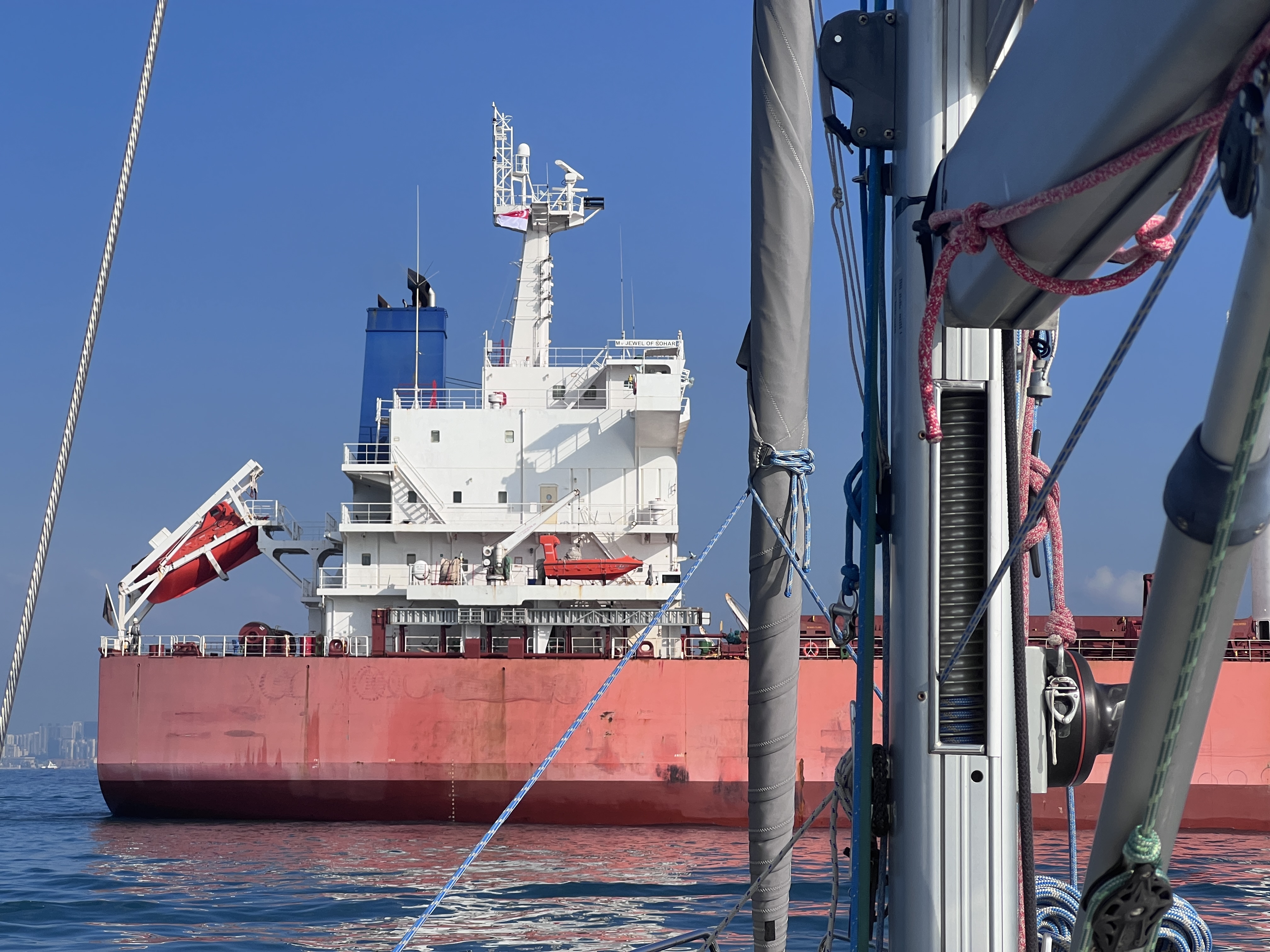 Die Fahrt durch die Straße von Singapore ist ein Abenteuer. Einerseits ist gute Planung bzgl. Strömung und Fahrtroute erforderlich, andererseits kommt man unweigerlich den großen Schiffen recht nahe. Für uns geht es erst südlich des Verkehrstrennungsgebietes etwas nach Westen. Die Bereiche an denen man das Verkehrstrennungsgebiet (quasi Fahrbahnen für die Großschiffahrt) überqueren darf sind in den Seekarten markiert, man darf nicht überall einfach drüber. Dann geht es im rechten Winkel über die Straße. Die Cargo-Schiffe fahren hier etwa im 10 Minuten Takt, in jede Richtung. Wir selbst benötigen ca 15 Minuten um eine Richtungsfahrbahn zu überqueren. Hier ist also Konzentration und gutes Timing erforderlich.
