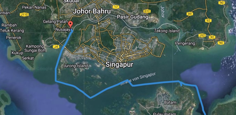 Nördlich des Verkehrstrennungsgebiets geht es dann weiter Richtung Westen, alleridngs immer schön außerhalb des Hafengebietes von Singapore, da wir ja nicht in Singapore einreisen möchten. So geht es dann westlich um die Insel Singapore rum, und von Westen kommend in die Straße von Johor hinein. Dann immer schön auf der malaysischen Seite de Fahrwassers bis nach Puteri Harbour.