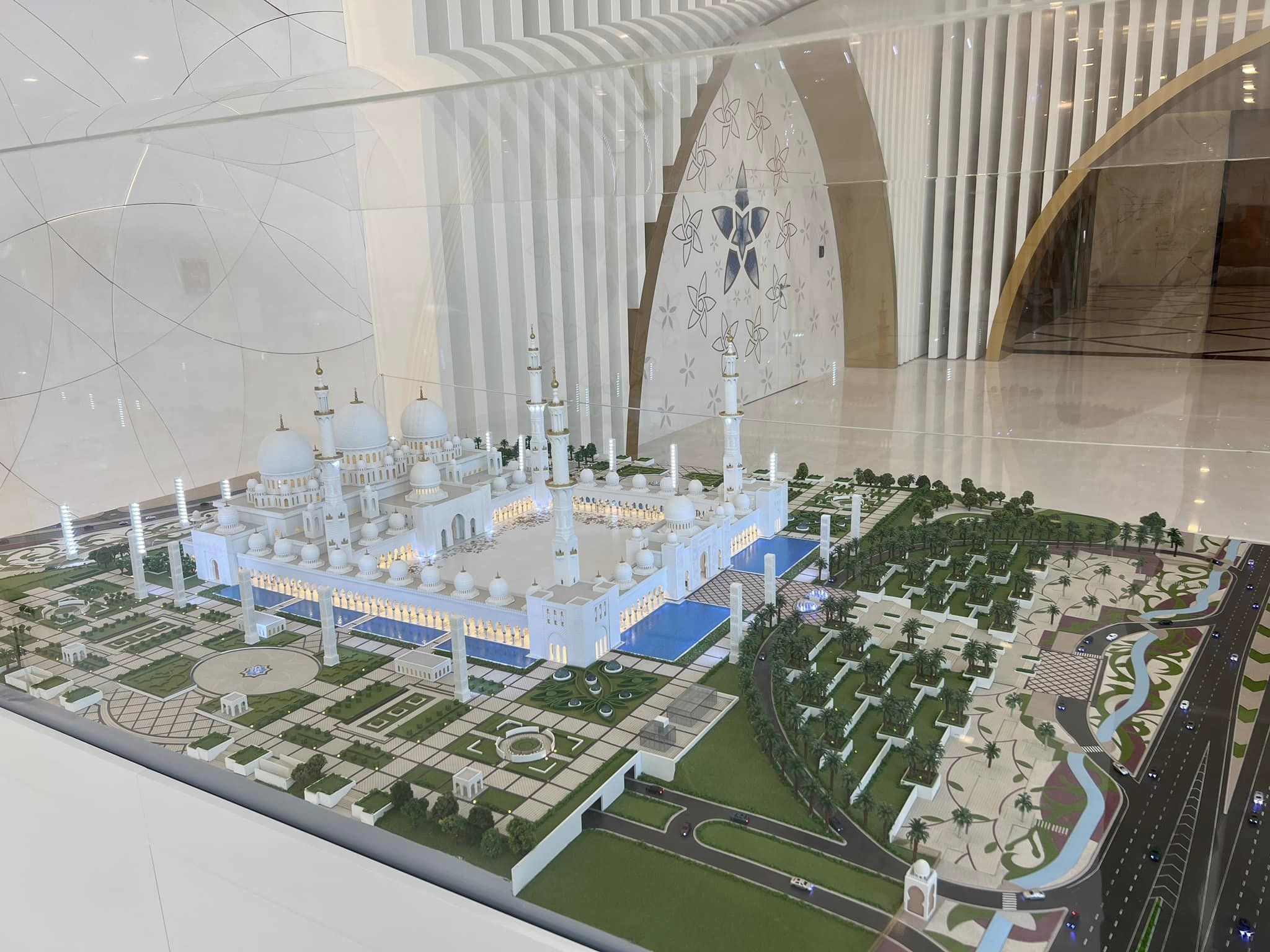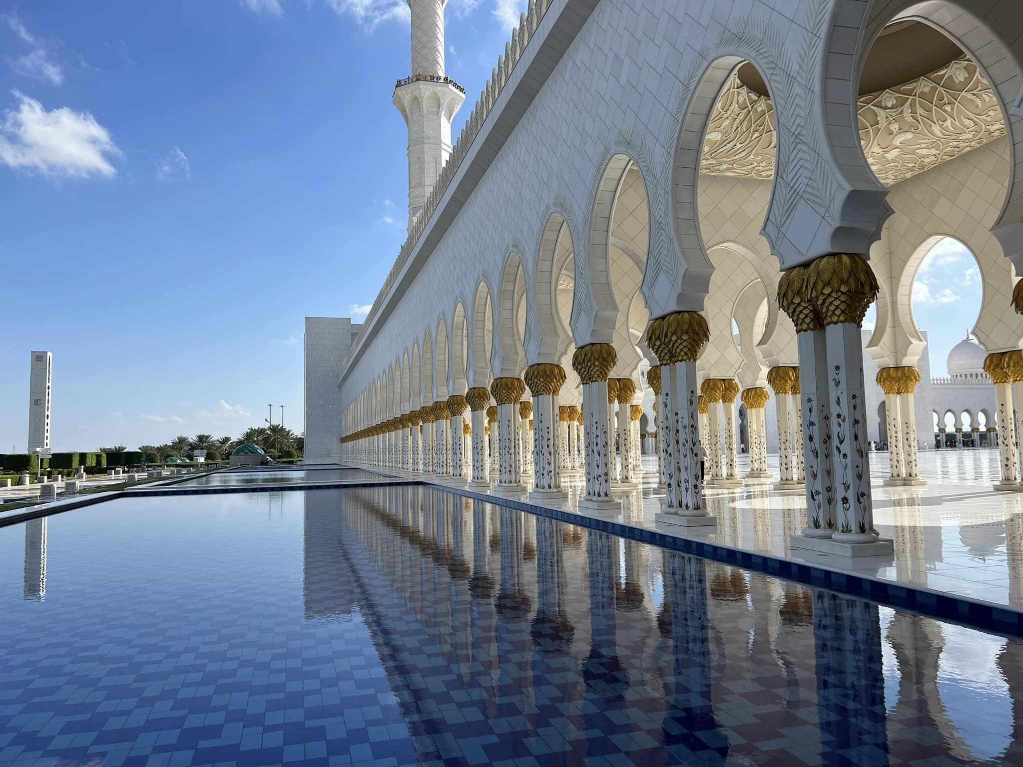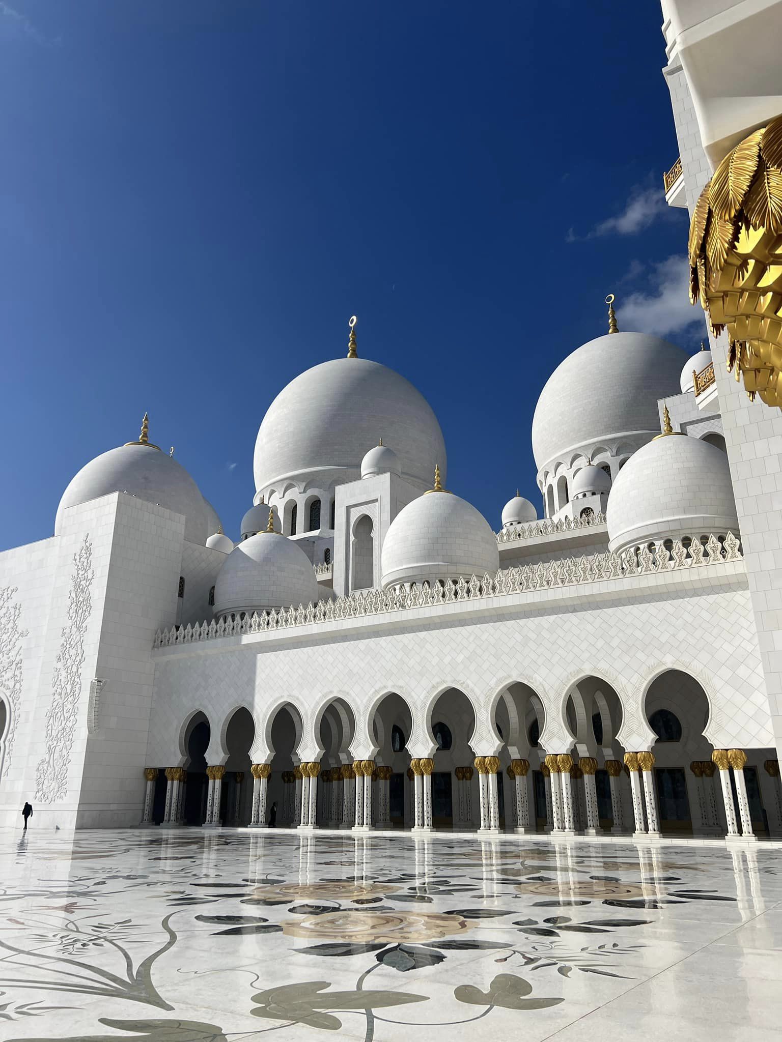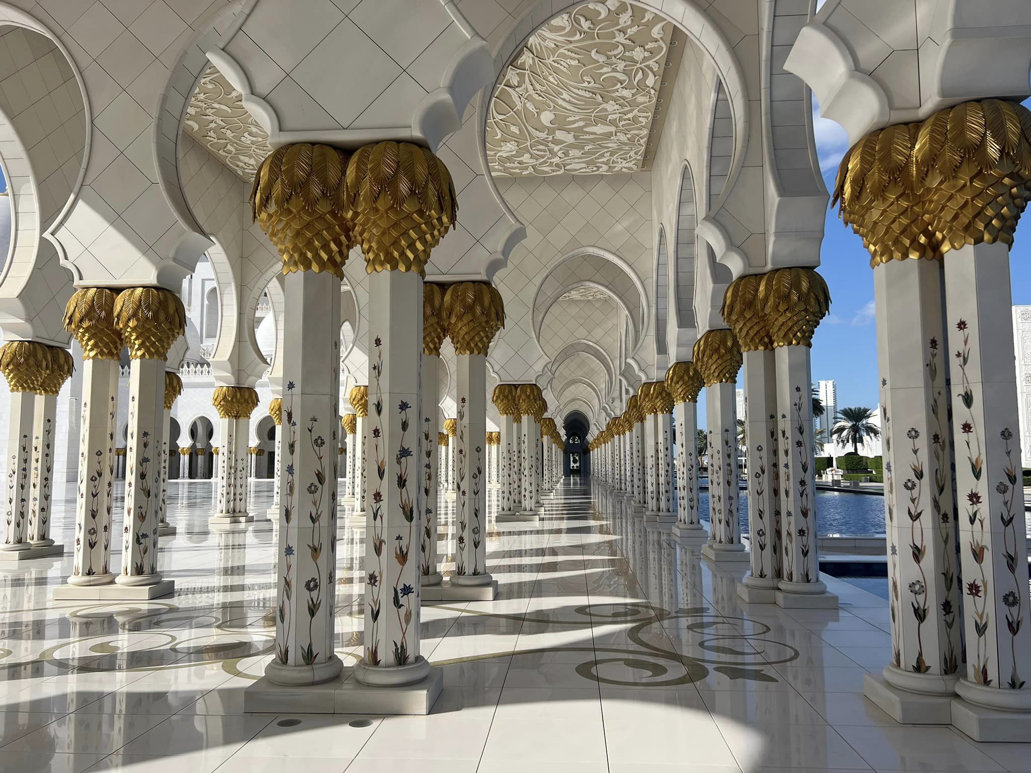 In der Sheikh Zayed Grand Mosque gibt es eine ganze Reihe an Superlativen zu bestaunen. Eine ist der weltgrößte handgeknüpfte Teppich in der Hauptgebetshalle der Moschee. Er besteht aus knapp 2,3 Mrd Knoten, hat eine Fläche von ca 5600m2, wiegt ~35t und wurde von grob 1200 Teppichknüpfern in einem Zeitraum von 2 Jahren geknüpft. Die Moschee ist riesig, aber bei Weitem nicht die weltgrößte.