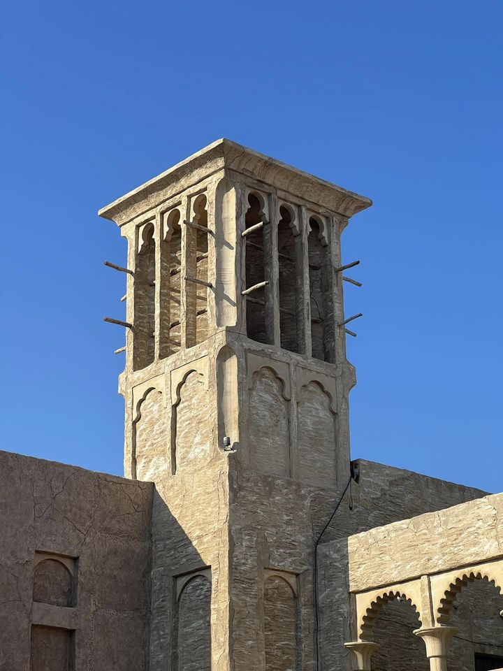 Old Town Dubai ist mehr ein Freilichtmuseum. Ein Großteil ist einfach nur nachgebaut, aber man bekommt trotzdem einen ganz guten Eindruck, wie man hier früher in Häusern mit „Kühltürmen“ lebte. Die Kühltürme bringen Wind von oben ins Geböude und dienen auch aus „Auslaß“ für die warme Luft aus dem Haus.