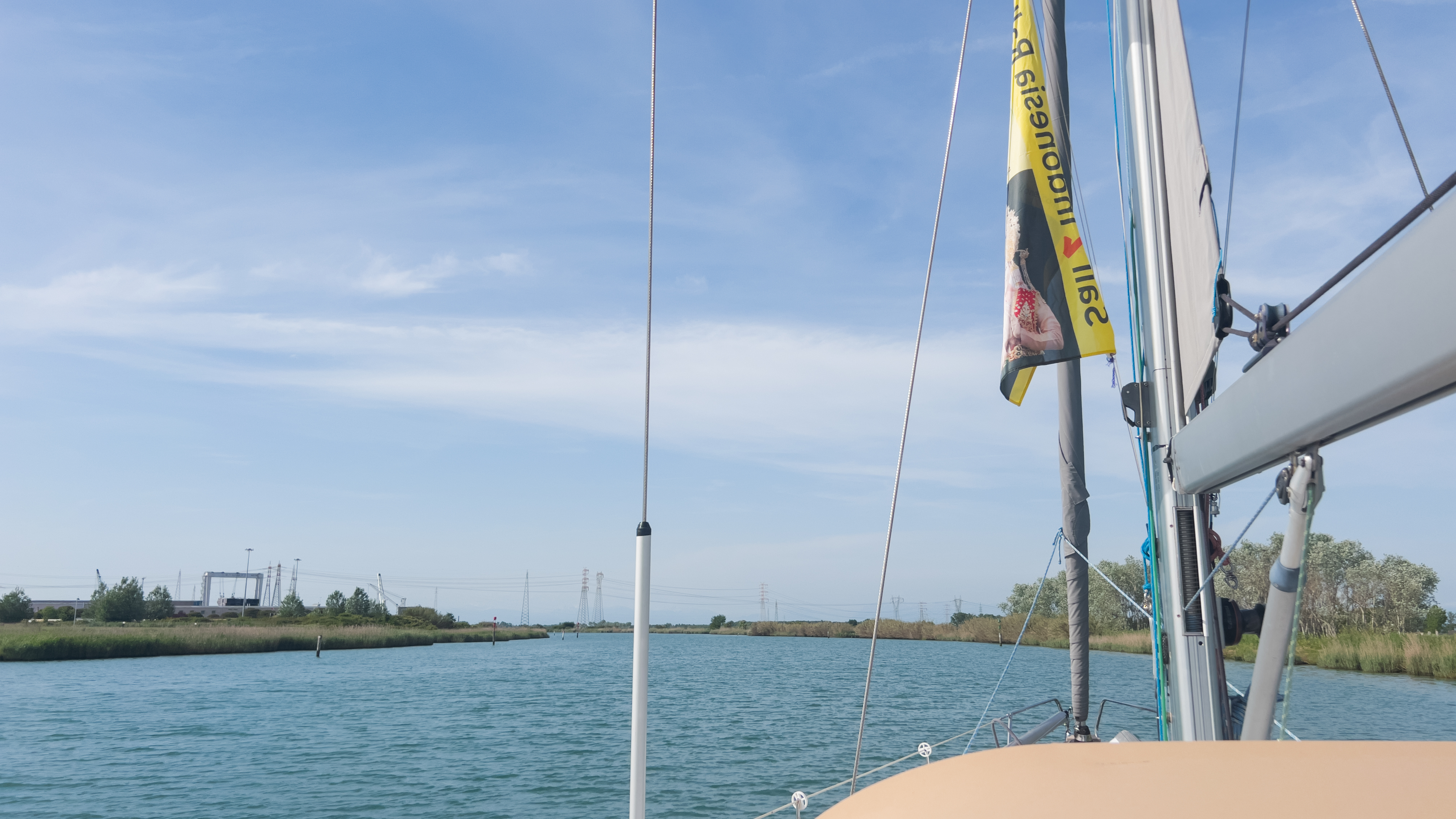 Auch wenn wir an diesem letzten Tag keinen Wind haben, ist es zumindest schön sonnig und angenehm warm. Wir motoren also über den Golf von Triest von Kroatien kommend in Richtung der Lagune westlich von Grado. Für uns geht es dann den Fluss Corno hinauf in Richtung San Giorgio di Nogaro. Wir beenden unsere Reise in der gleichen Marina, in der wir 2020 losgefahren sind.